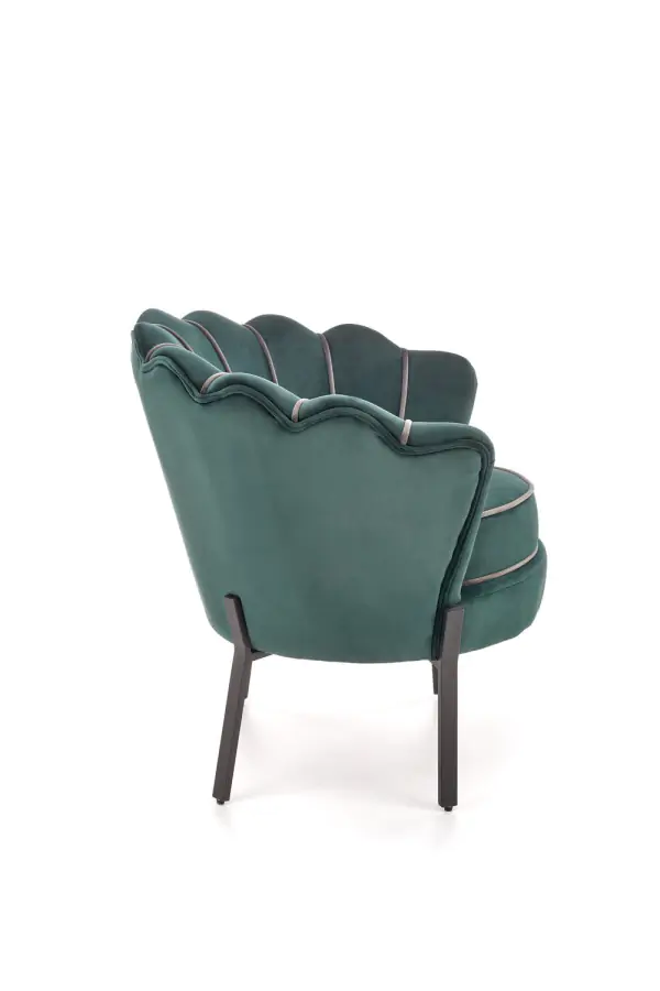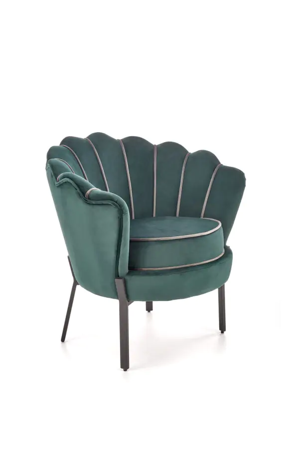 Elegantní křesílko ve tvaru mušle se hodí do obývacího pokoje, ložnice, pracovny apod. Je čalouněné tmavě zelenou látkou, nožičky jsou z kovu v černé barvě. Prohlédněte si i další kousky v ...