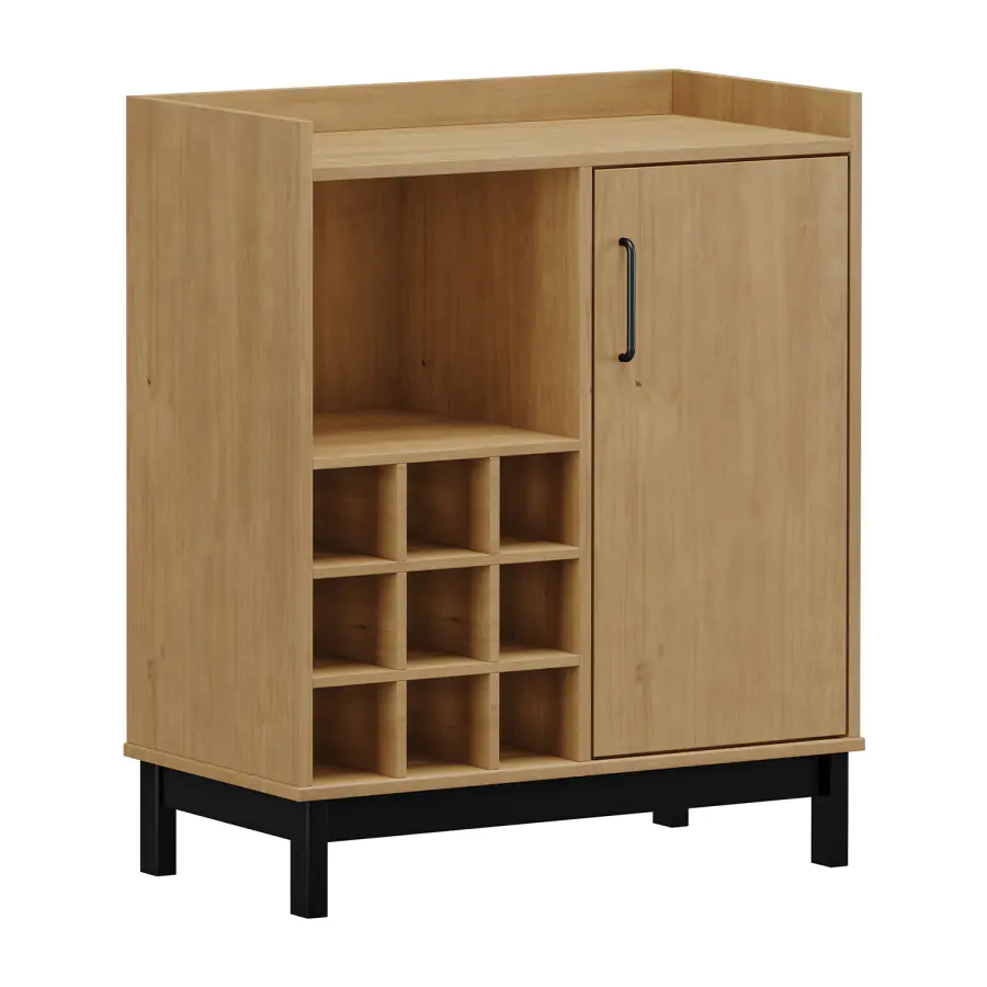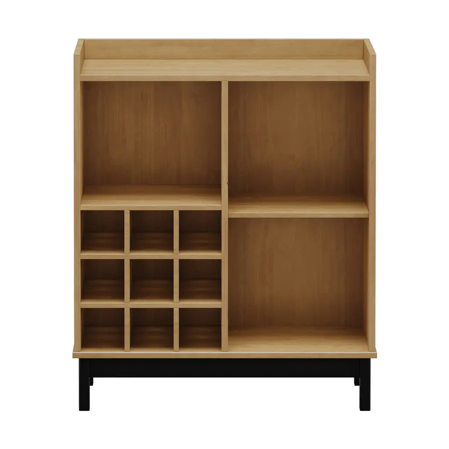 Disponuje prostorem k uložení vín, 2 většími policemi za zavřenými dvířky s černou kovovou úchytkou a odkládací plochou v horní části.