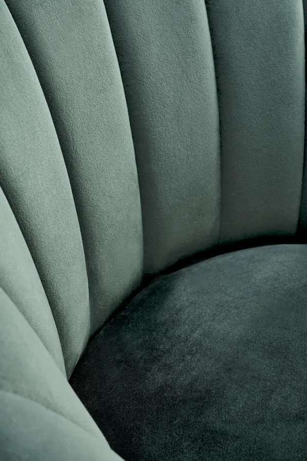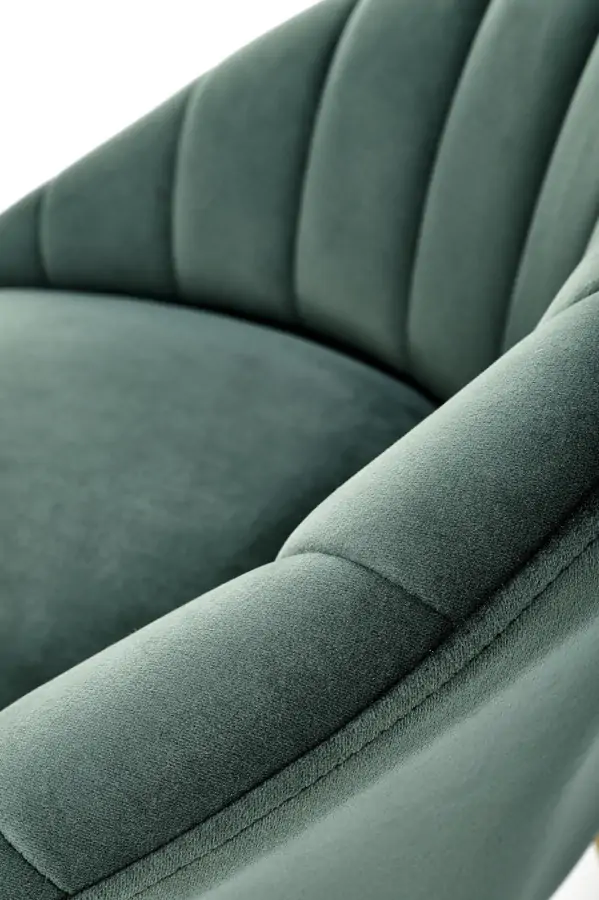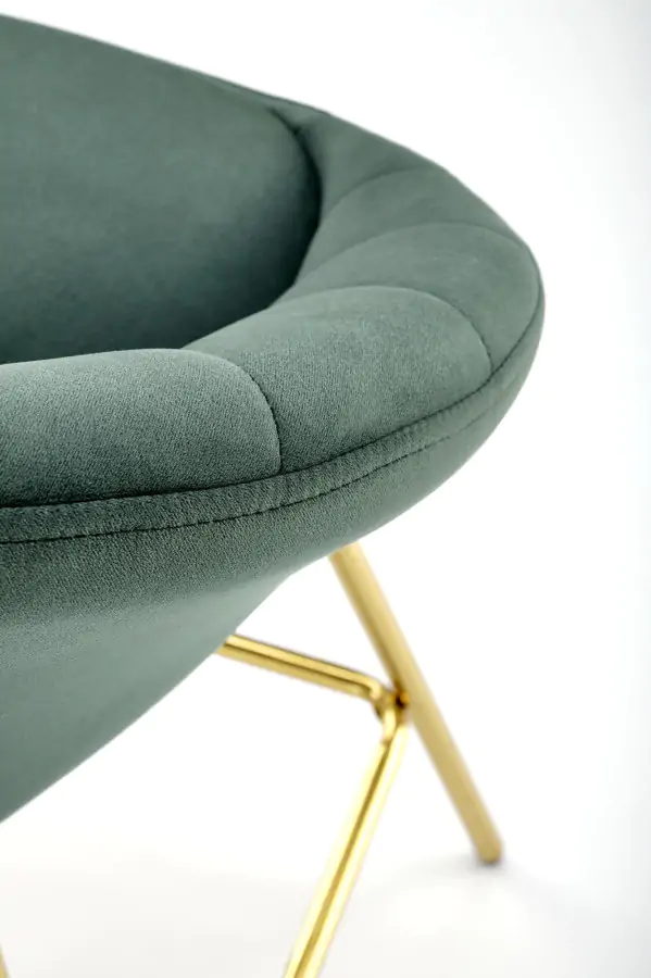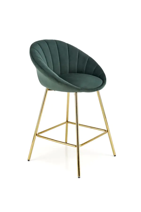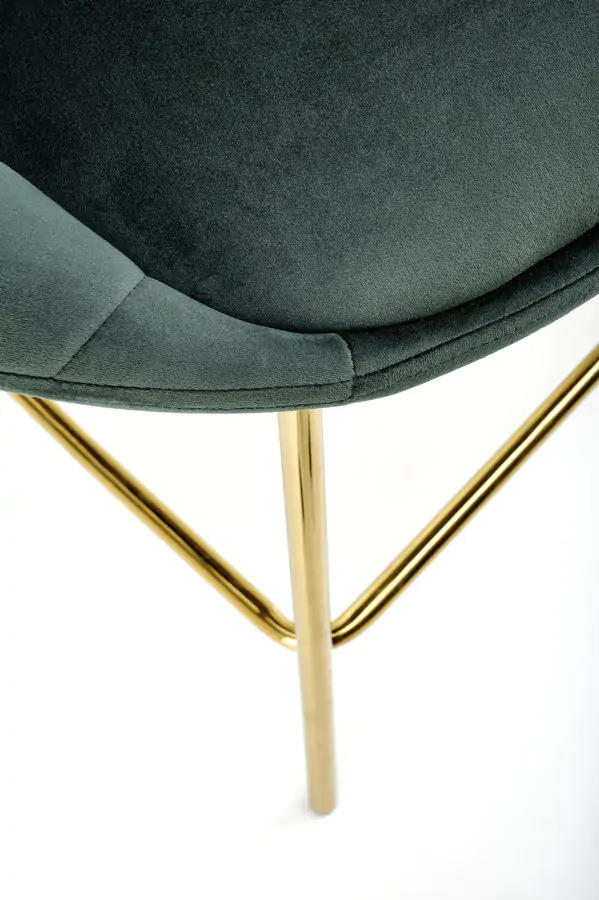 Barová židle H112 vytváří poutavý kontrast mezi zeleným prošitým sedákem a zlatou kovovou podnoží.