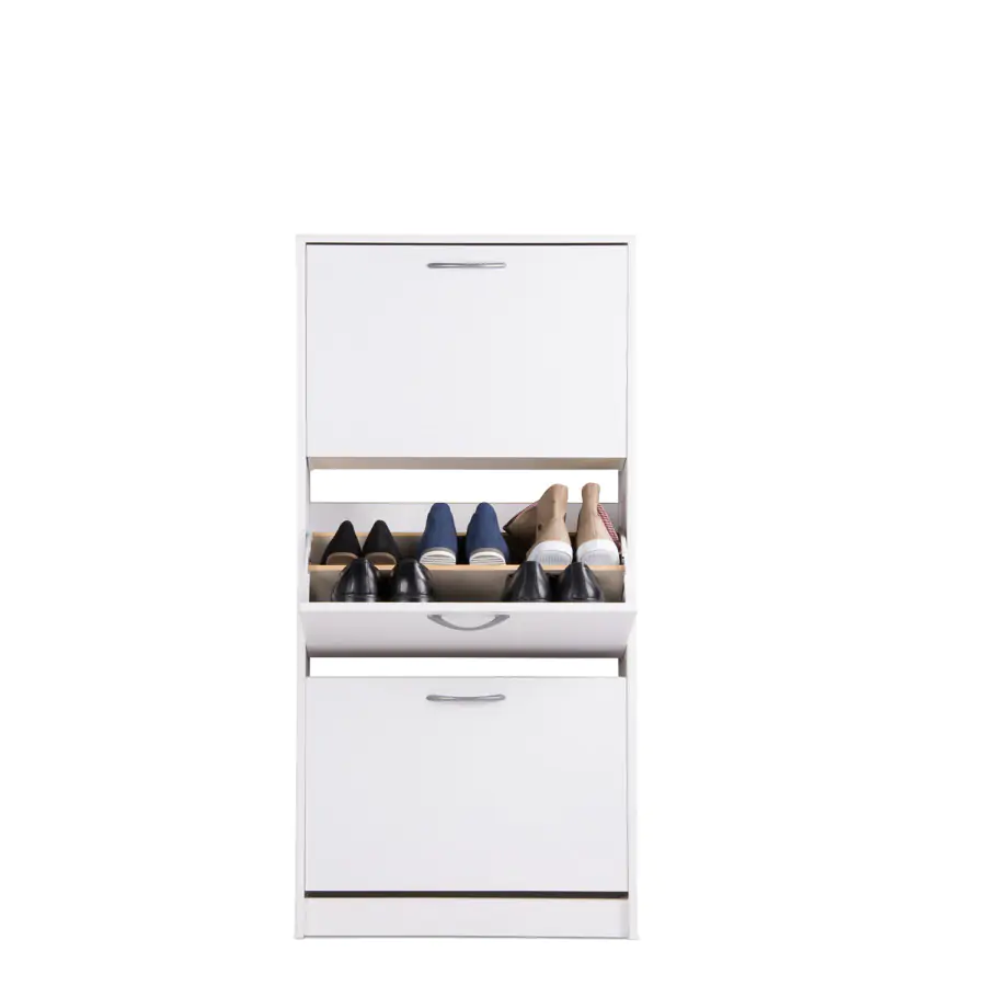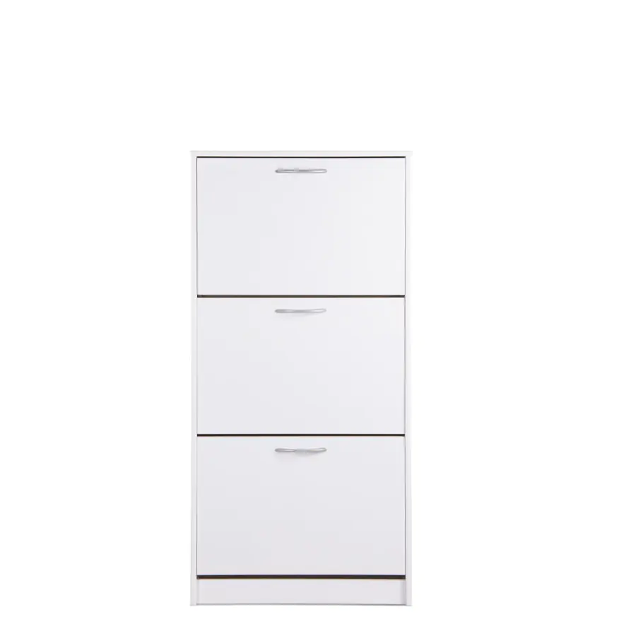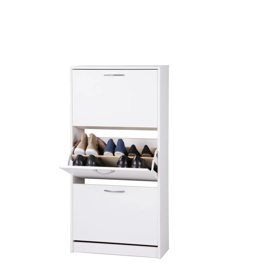 Jednoduchý a praktický výklopný botník je vyroben z laminované dřevotřísky v bílé barvě. Tři dvouřadé výklopné zásuvky nabízí prostor na 18 párů bot.
