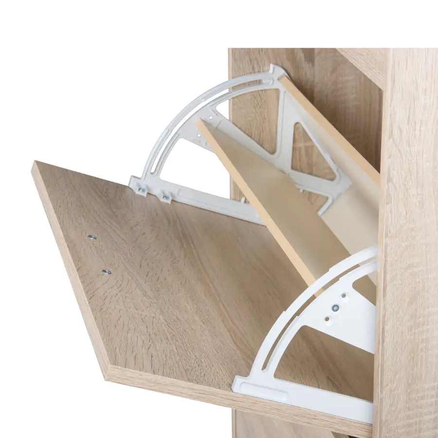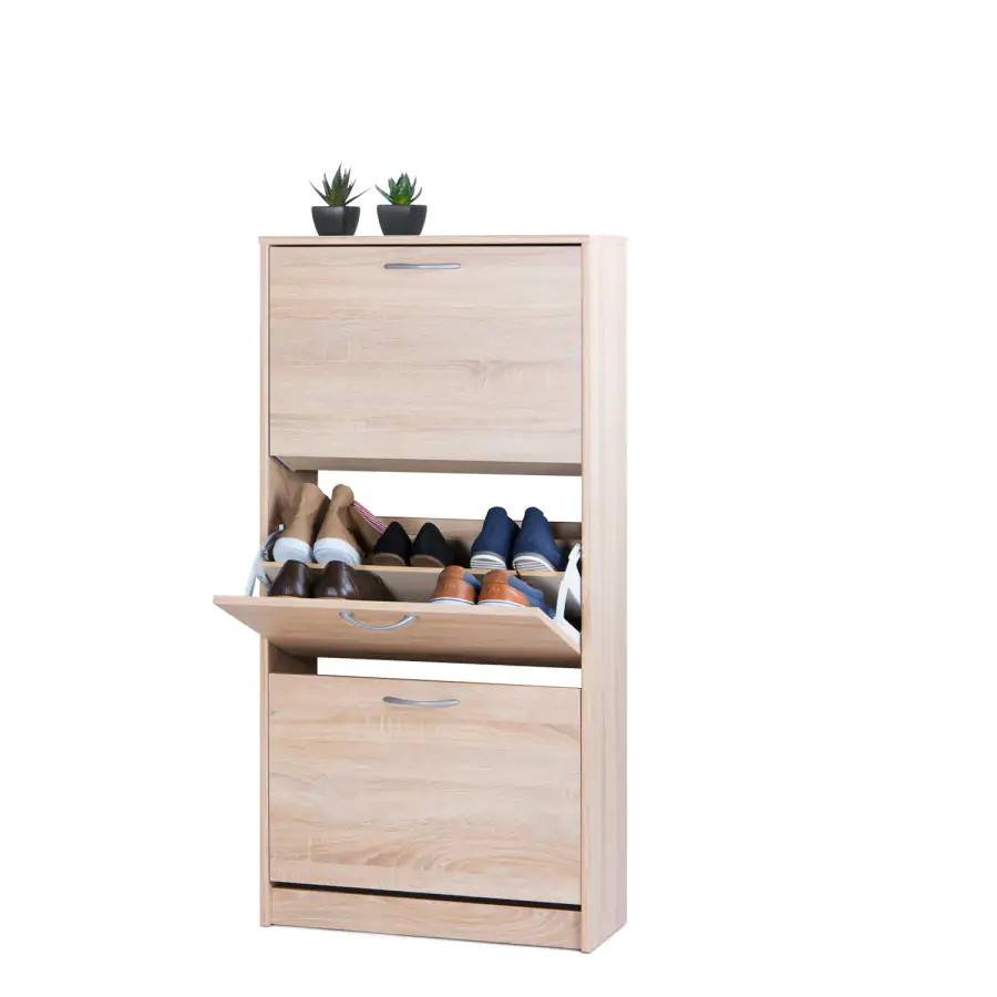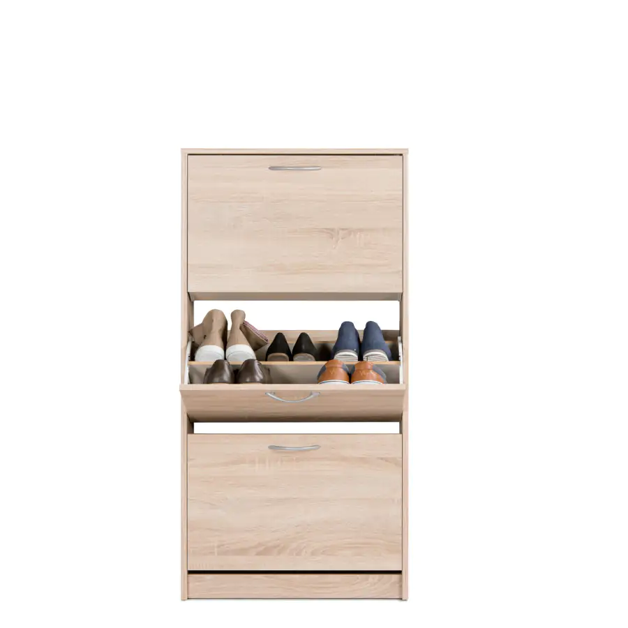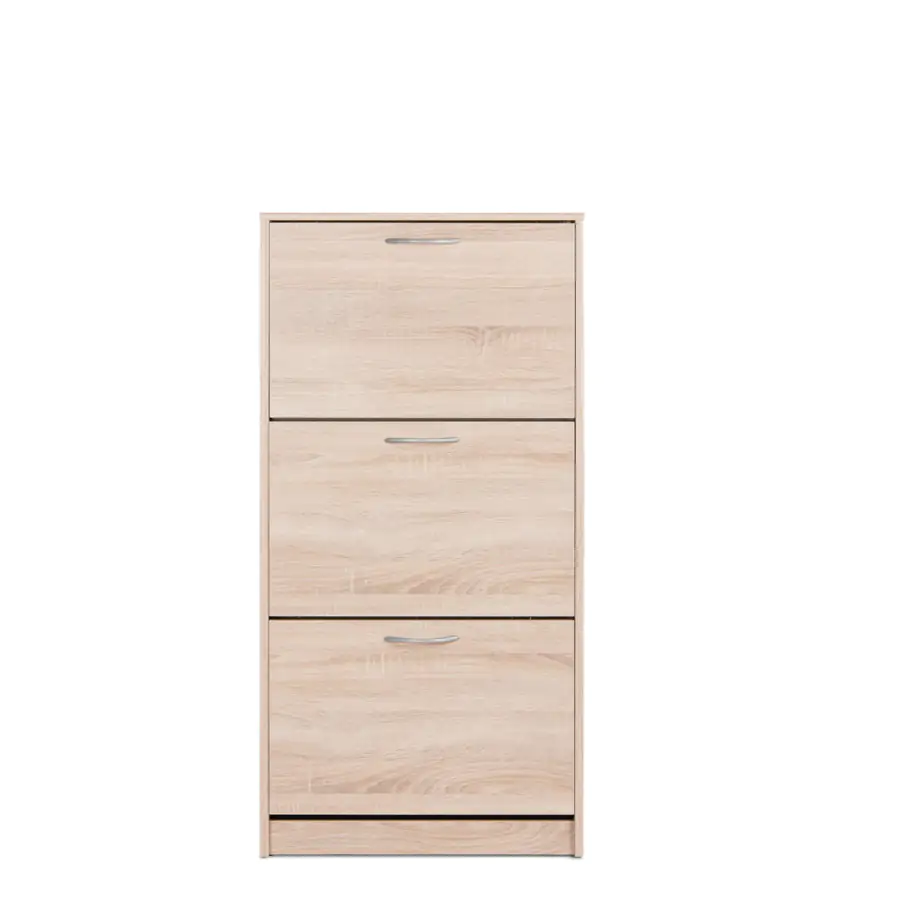Jednoduchý a praktický výklopný botník je vyroben z laminované dřevotřísky v barevném provedení dub sonoma. Tři dvouřadé zásuvky nabízí prostor na 18 párů bot.