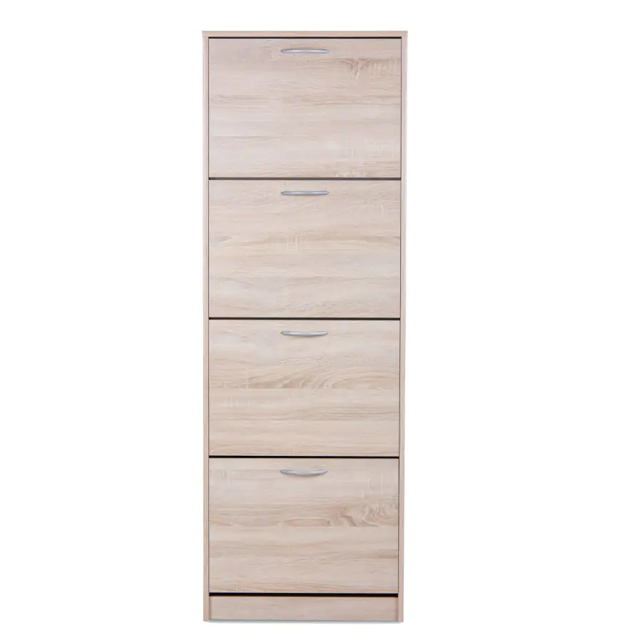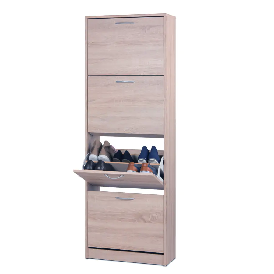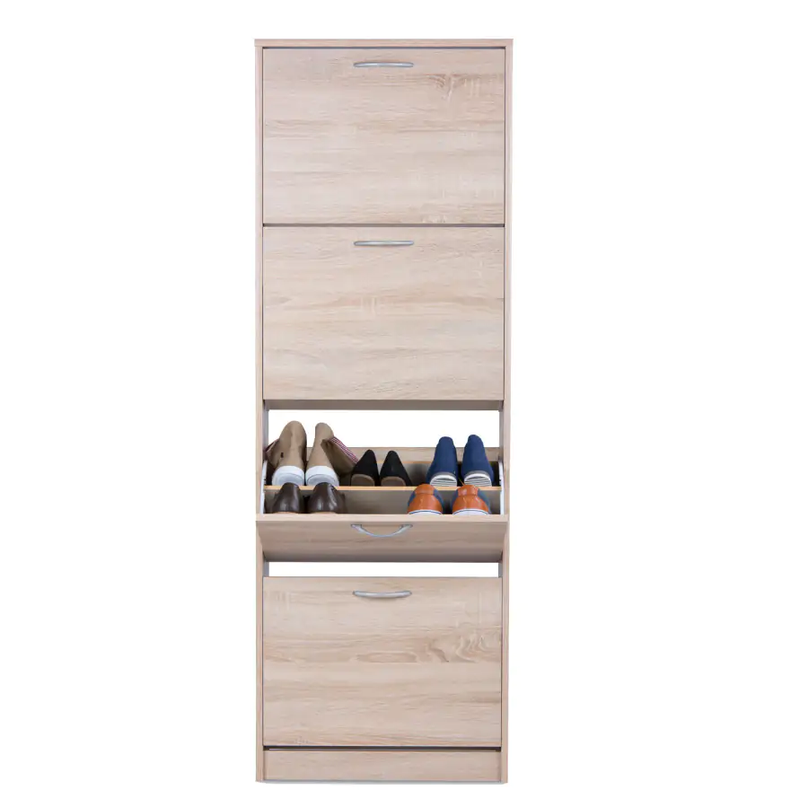 Jednoduchý a praktický výklopný botník je vyroben z laminované dřevotřísky v barevném provedení dub sonoma. Čtyři dvouřadé výklopné zásuvky nabízí prostor na 24 párů bot.