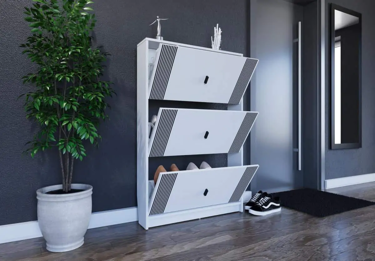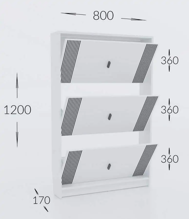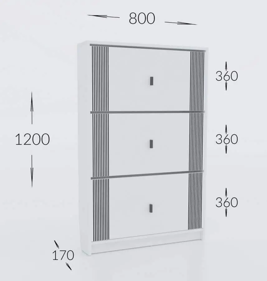Třídveřový výklopný botník LITE 1 je vyrobený v moderním provedení v barvě matná bílá v kombinaci s dekoračními šedými proužky.