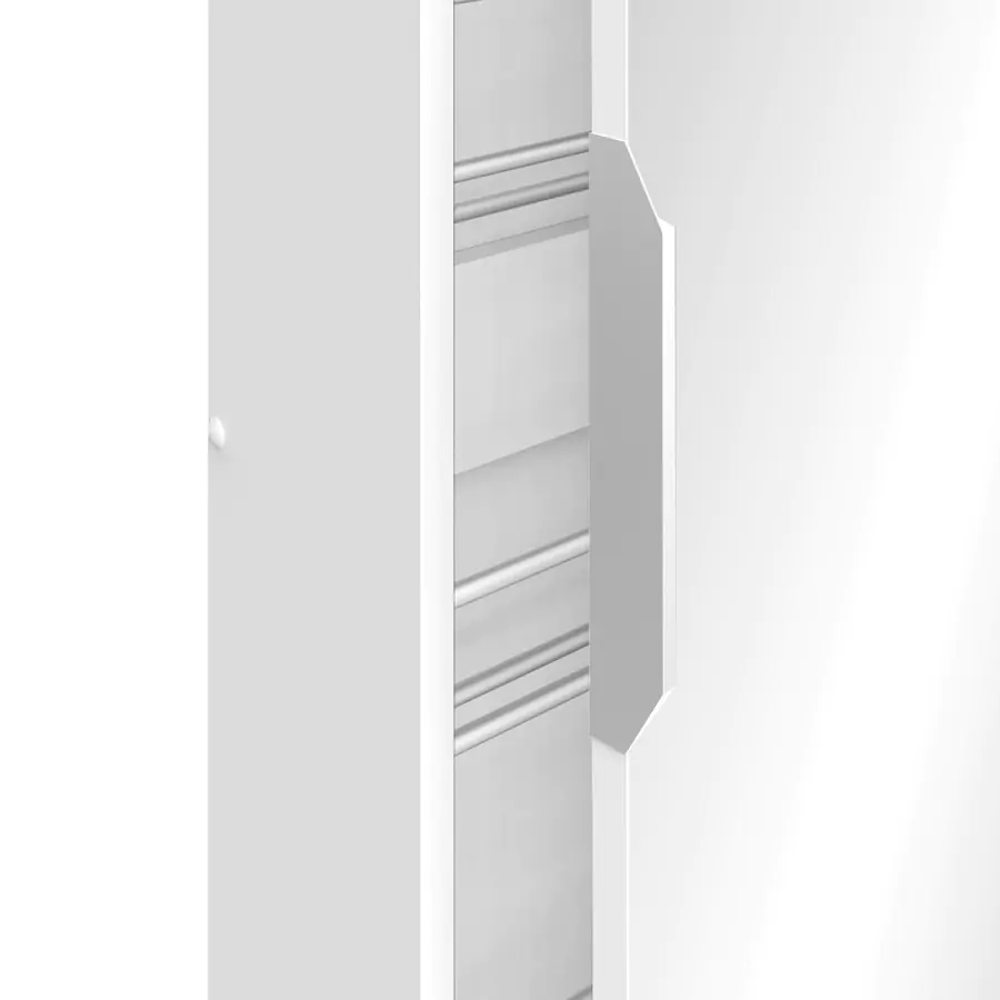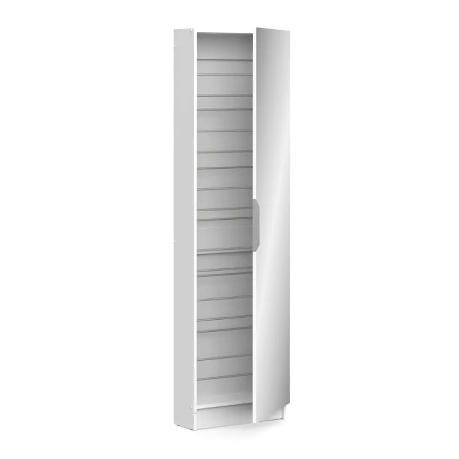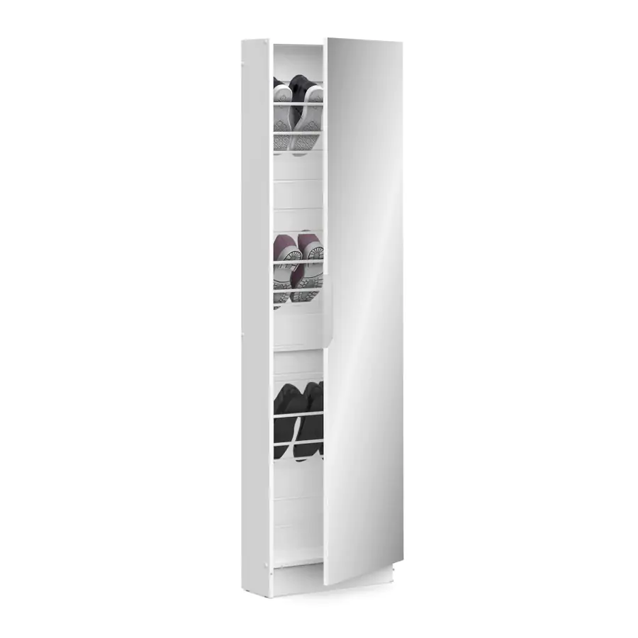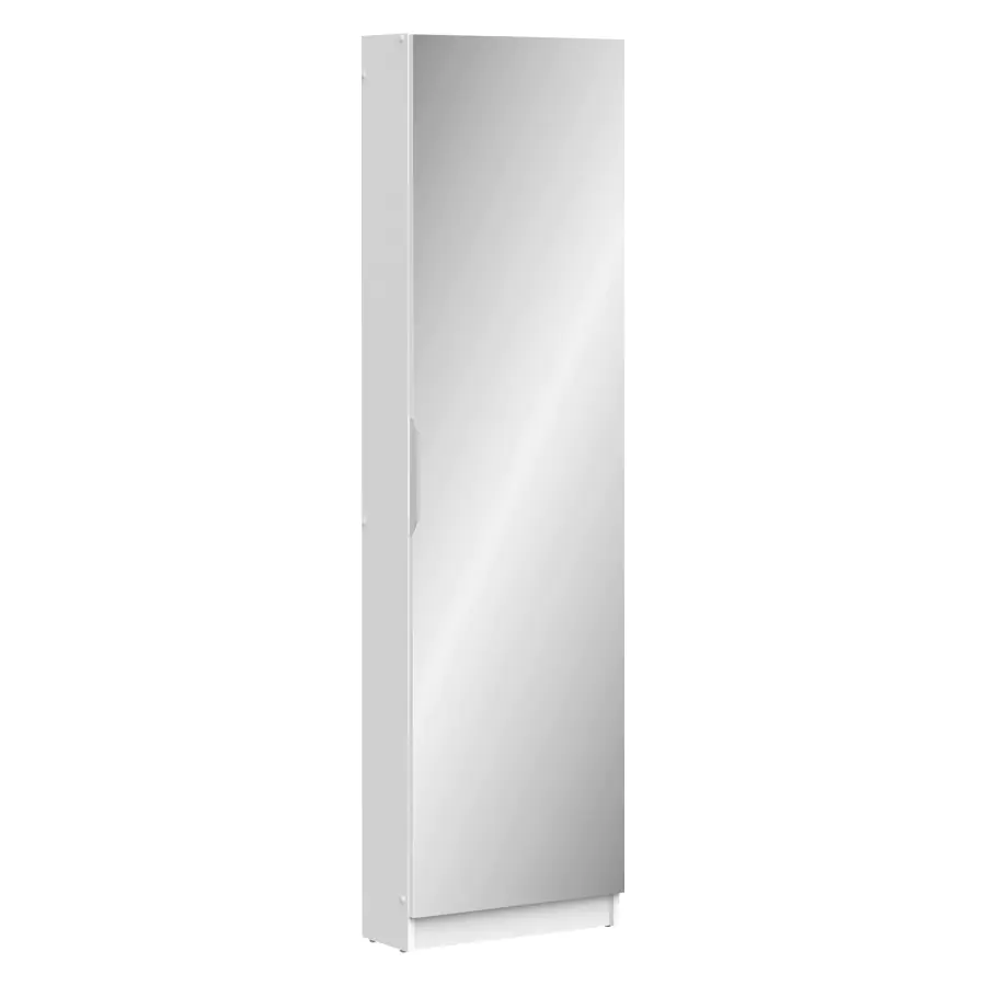 Jednoduchý a moderní skříňový botník je vyroben z laminované dřevotřísky v barevném provedení bílá. Přední stranu dveří tvoří praktické zrcadlo opatřeno kovovou úchytkou.