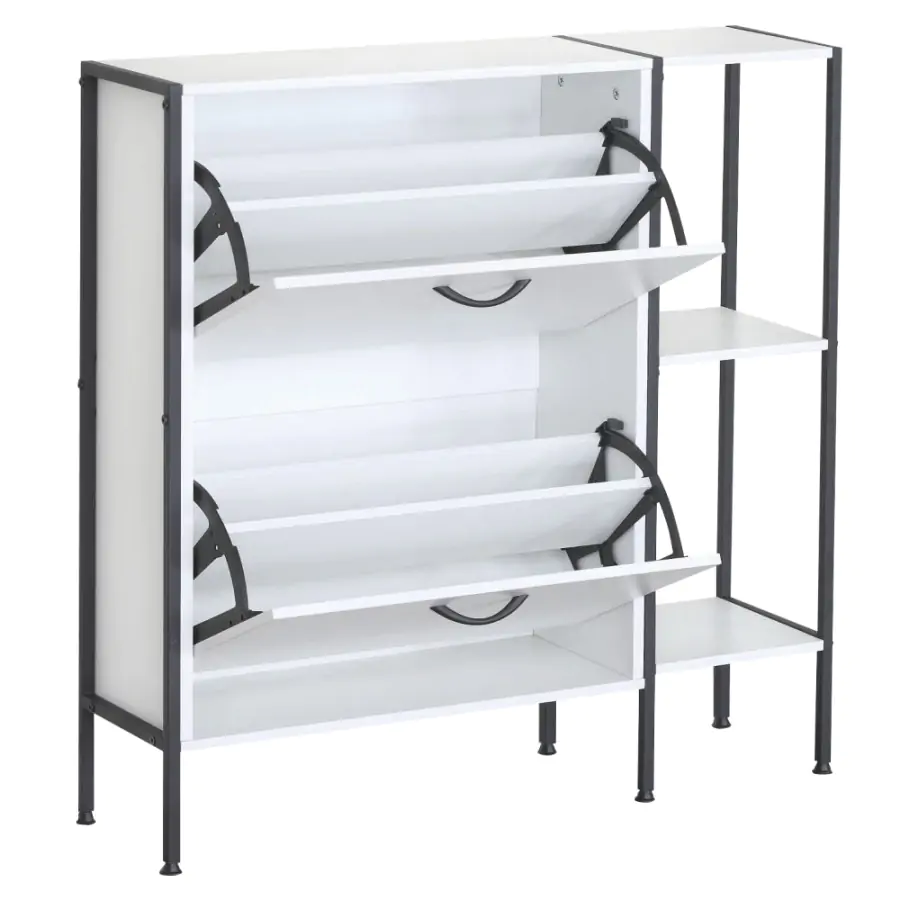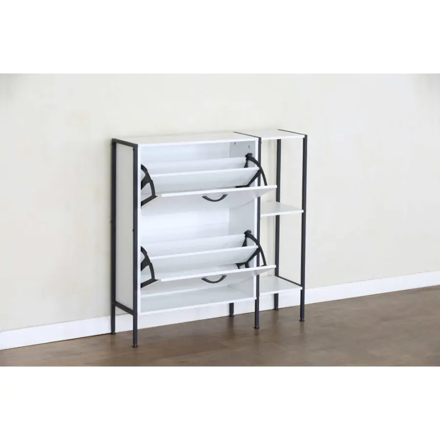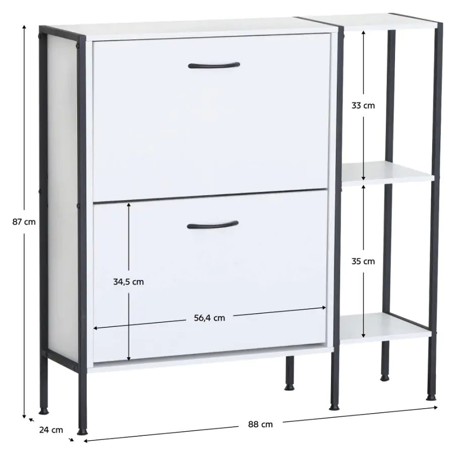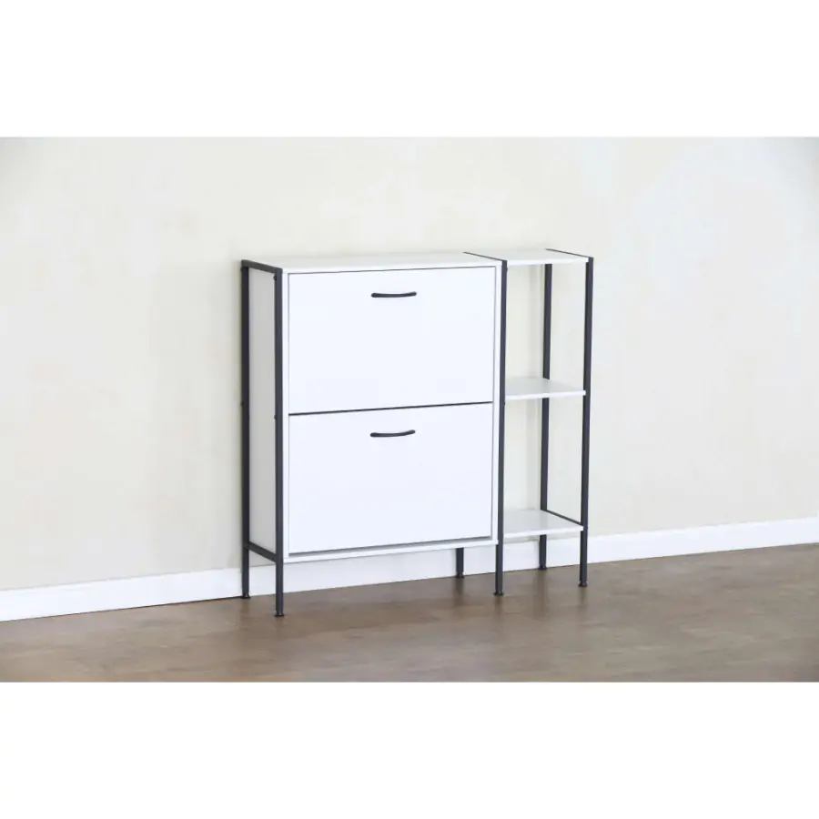 Dva výklopné šuplíky s praktickým vnitřním dělením poskytují dostatek místa pro různé typy obuvi, zatímco boční poličky nabízejí prostor pro dekorace či drobnosti.