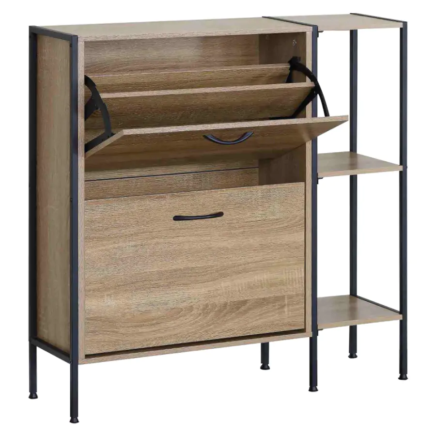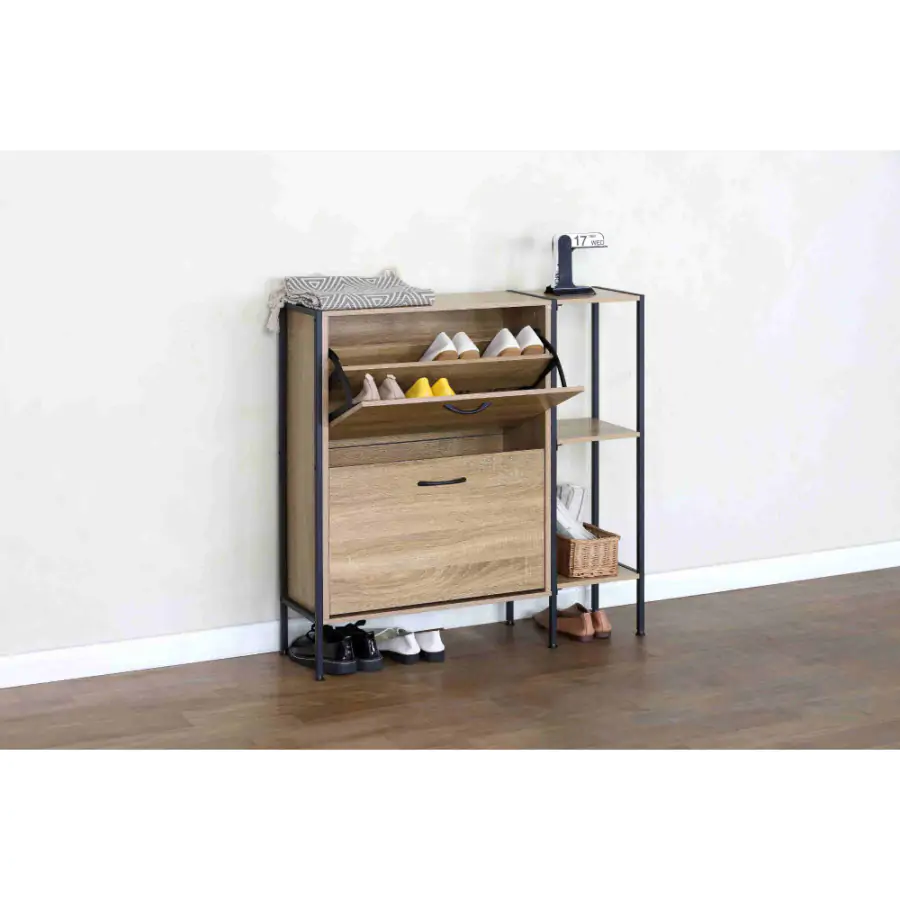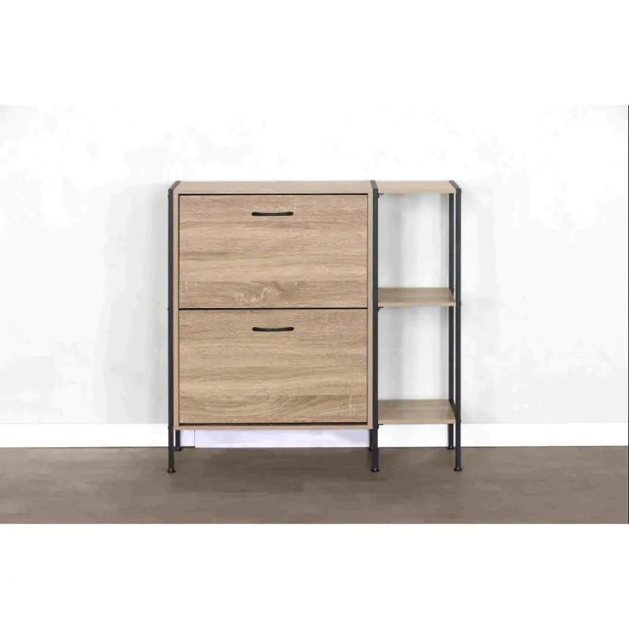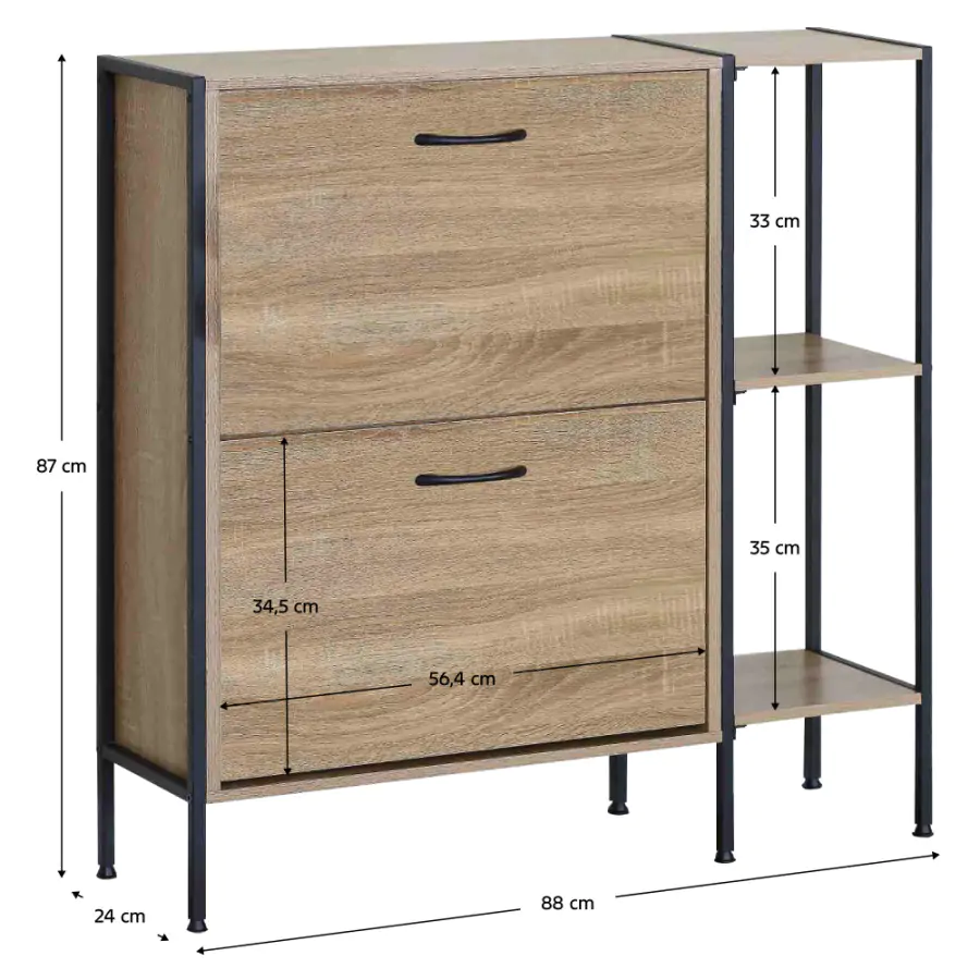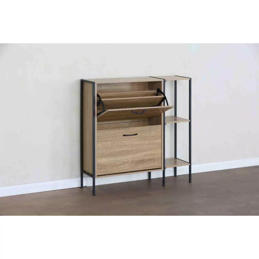 Moderní botník SOVIO spojuje funkčnost a styl, ideální pro přehledné uspořádání obuvi a oživení vstupního prostoru. Dva výklopné šuplíky s praktickým vnitřním dělením poskytují dostatek místa pro různé typy obuvi, zatímco boční poličky nabízejí prostor pro dekorace či drobnosti.