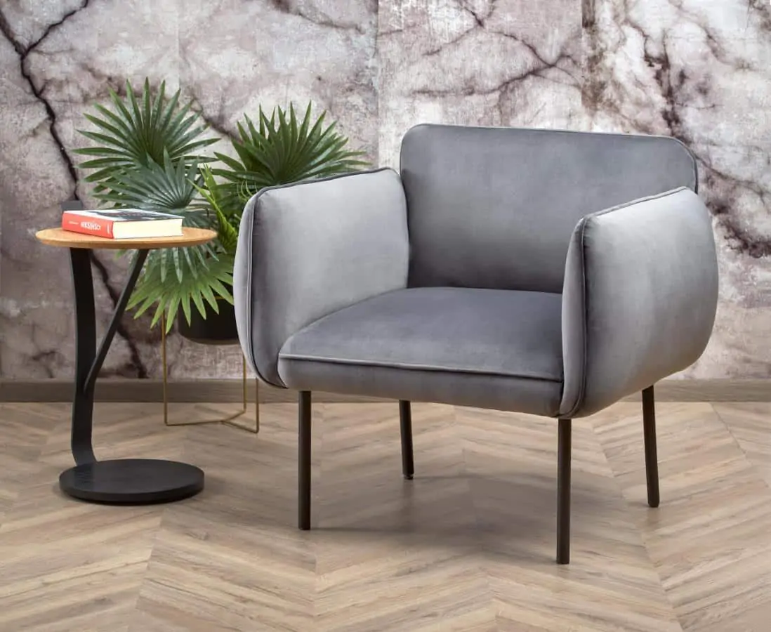 Moderní křeslo Brasil dokonale oživí váš interiér a poskytne příjemnou relaxaci. Je čalouněné šedou sametovou látkou Velvet. Nohy jsou z práškované oceli v černé barvě. Dodávané v demontu. Pro...