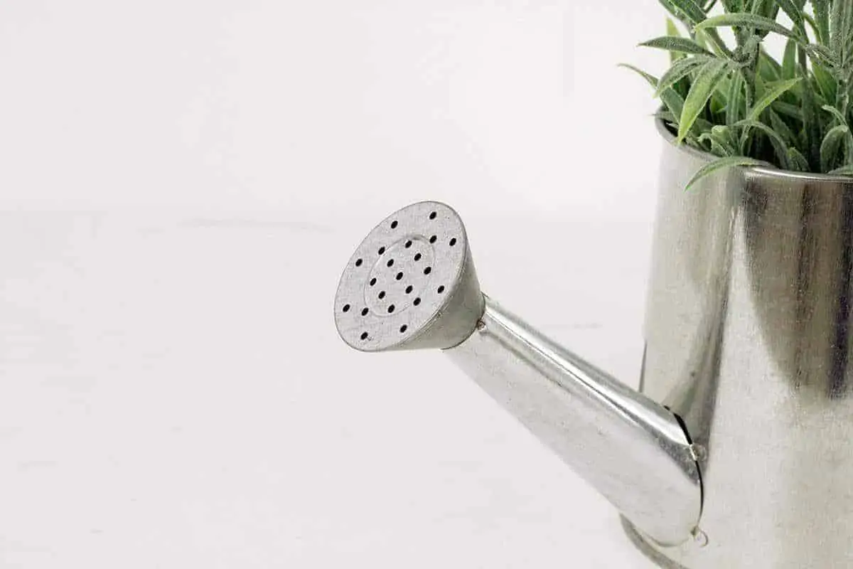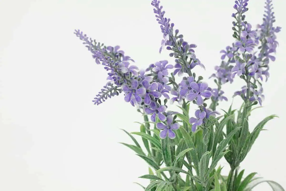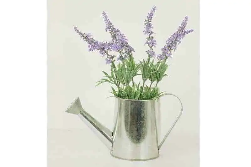 Umělá levandule v kovovém obalu ve tvaru konvičky.