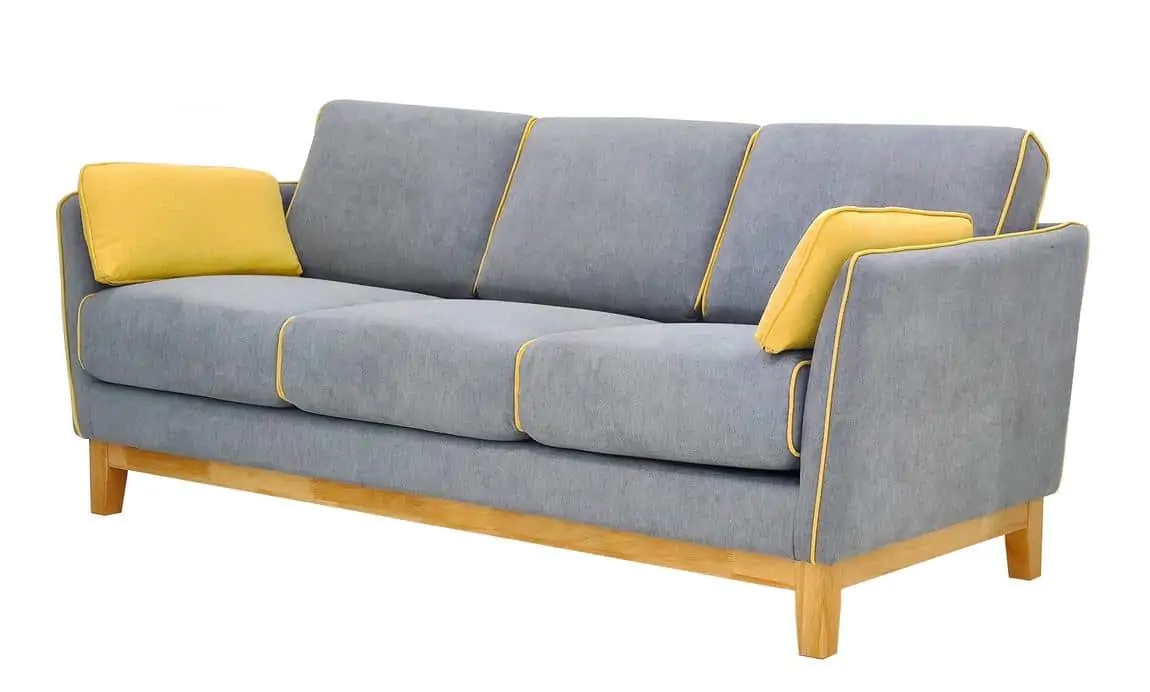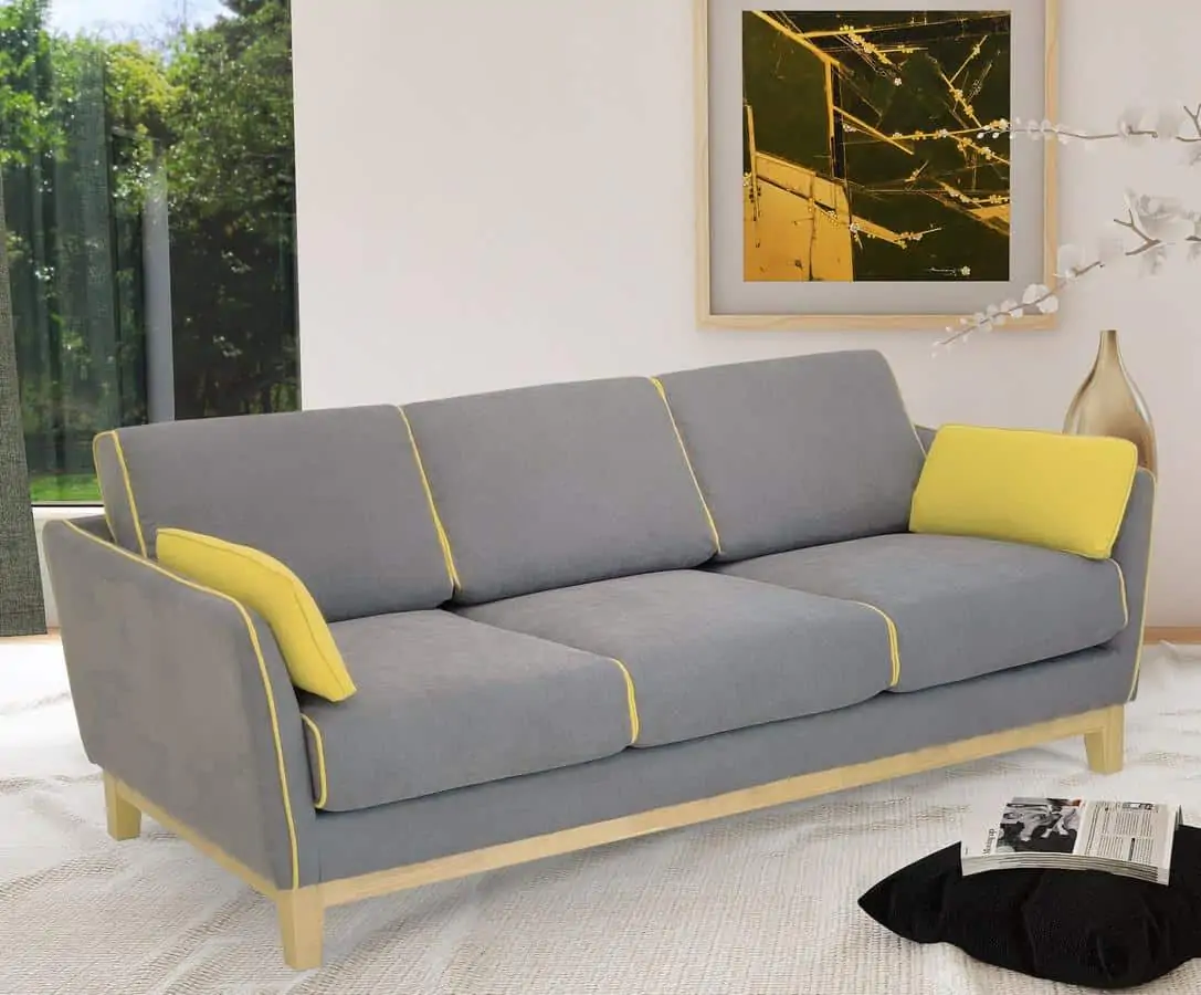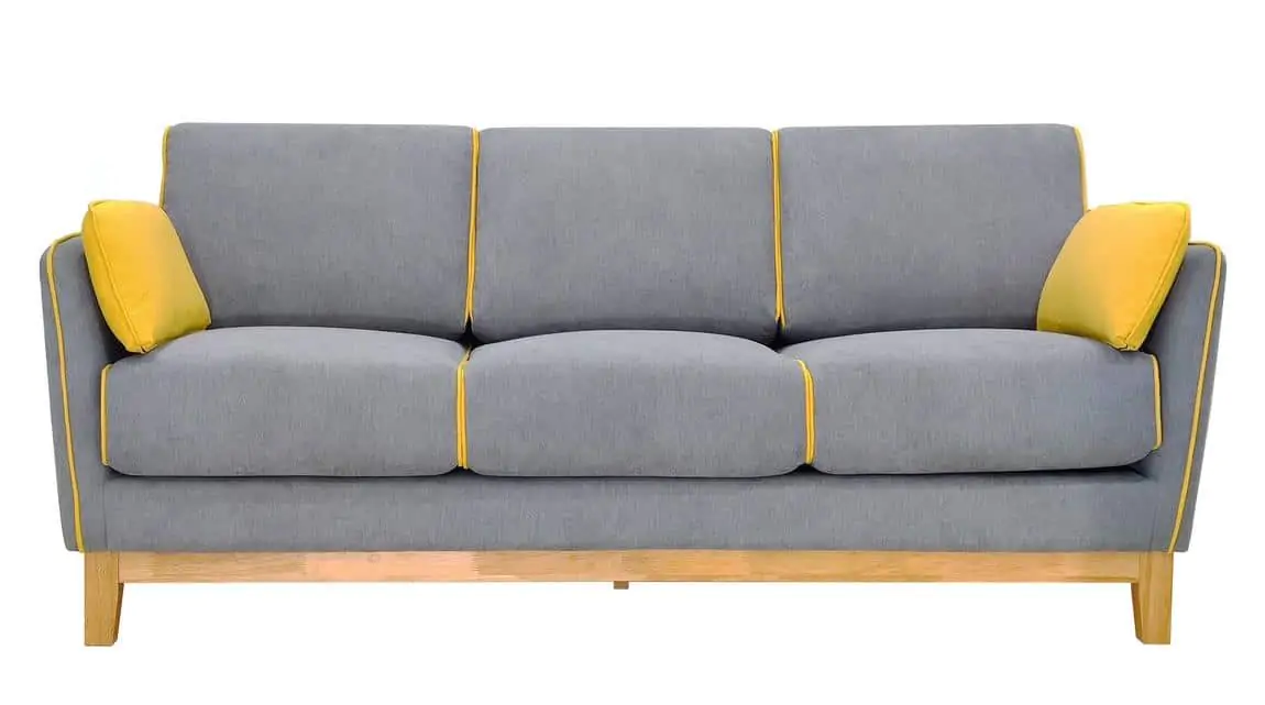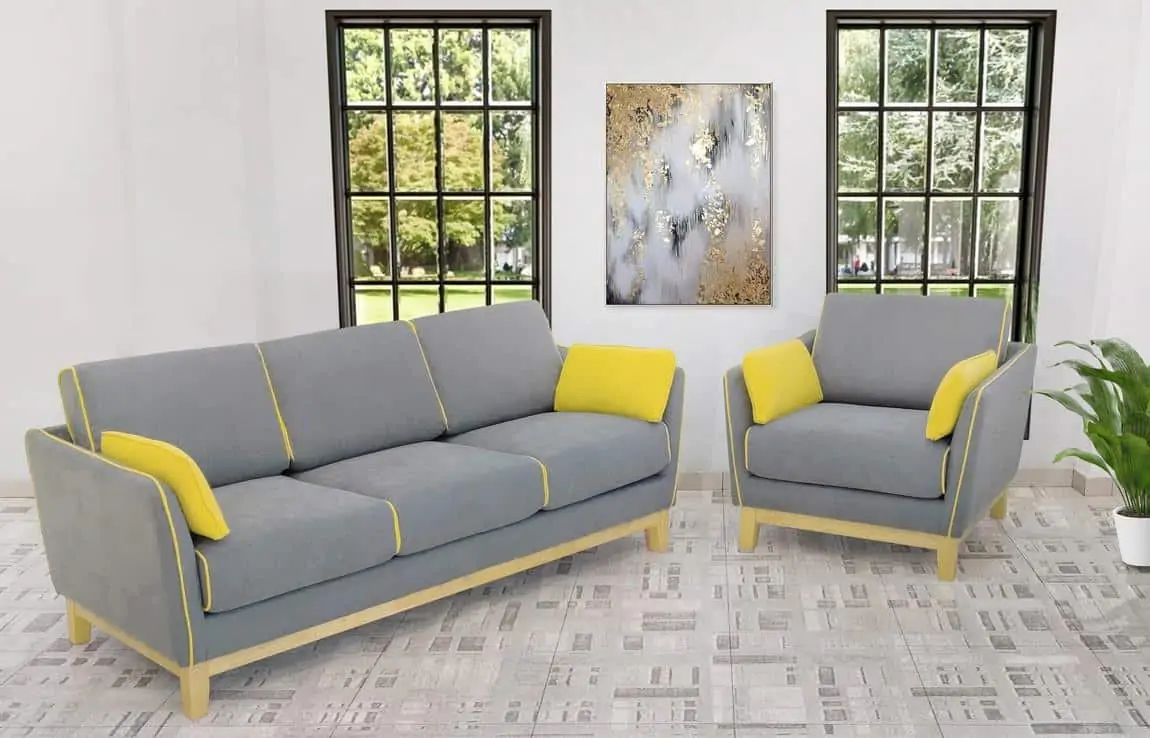 Elegantní celočalouněný trojsedák bude ozdobou každého interiéru. Konstrukce je ze dřeva v barvě teak, čalounění je z látky dle vyobrazení šedé barvy doplněné o ozdobný lem hořčicově žluté barvy. ...
