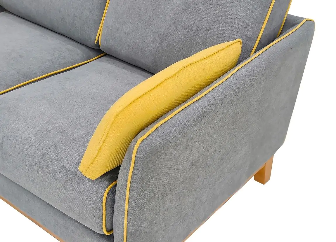 Konstrukce je ze dřeva v barvě teak, čalounění je z látky dle vyobrazení šedé barvy doplněné o ozdobný lem hořčicově žluté barvy.