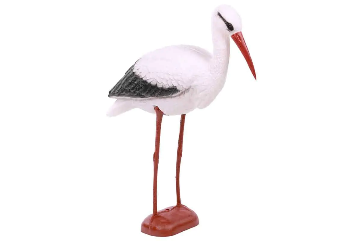 Čáp - zahradní dekorace zhotovená z plastu.