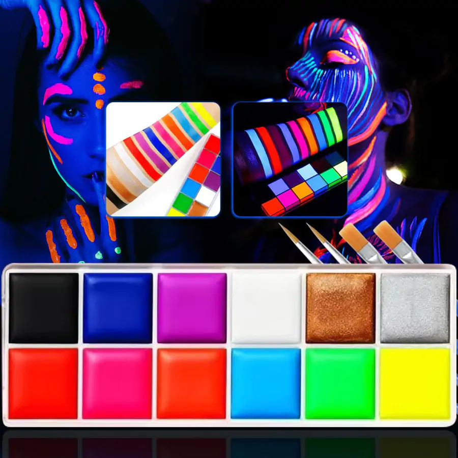 Neonové barvy na obličej a tělo rozzáří každou dětskou párty nebo karneval. Sada obsahuje 12 zářivých odstínů, které byly speciálně navrženy tak, aby intenzivně svítily pod UV světlem.