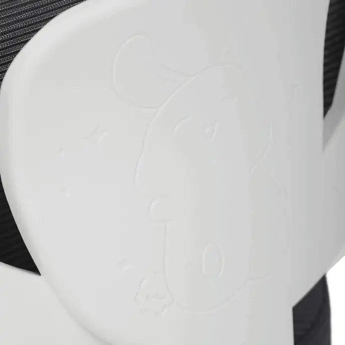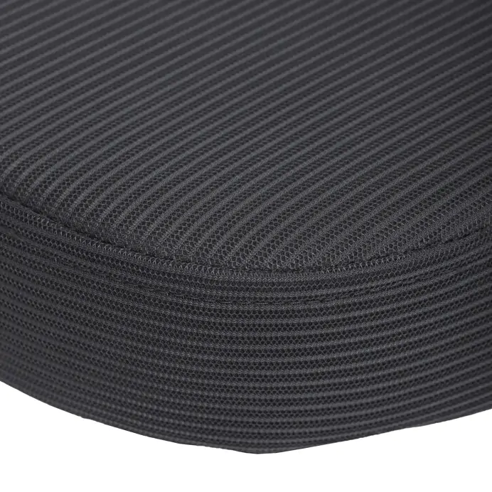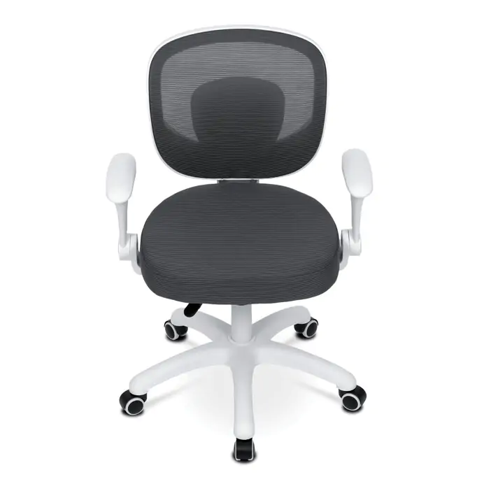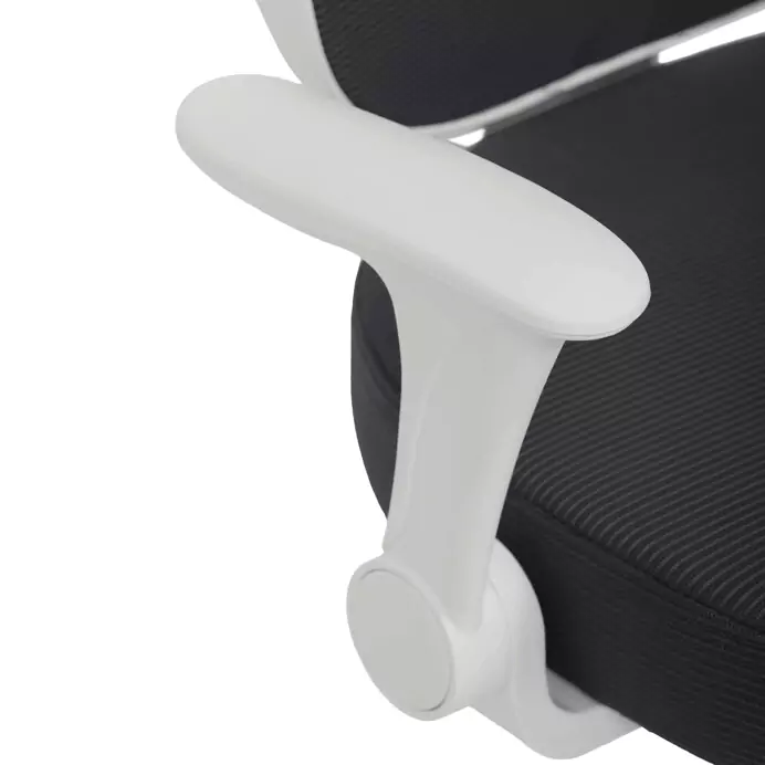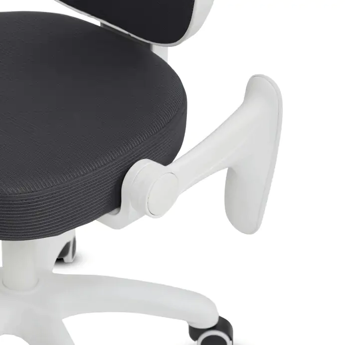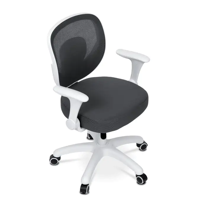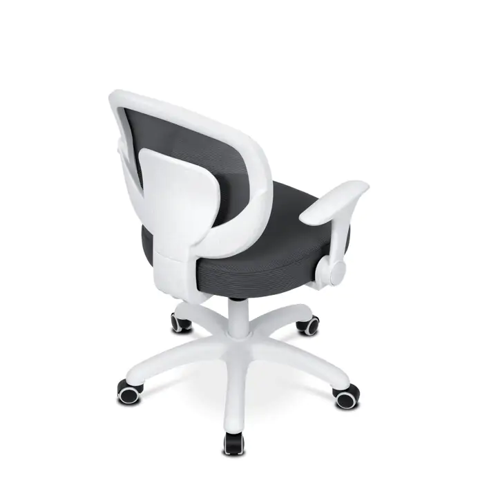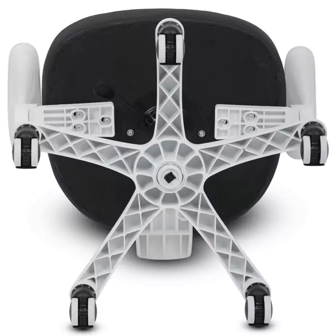 Opěradlo je z lehké a pevné síťoviny, která podporuje cirkulaci vzduchu, zatímco sedák je čalouněný látkou stejné barvy pro příjemný komfort. Bílé plastové nohy s pěti rameny zajišťují stabilitu a jsou vybaveny kolečky určenými pro tvrdé podlahy, což umožňuje snadný pohyb bez poškození povrchu.
