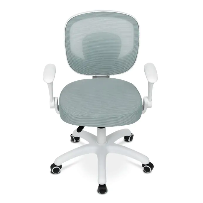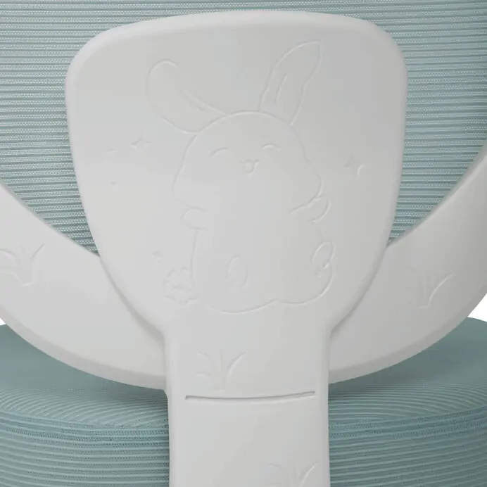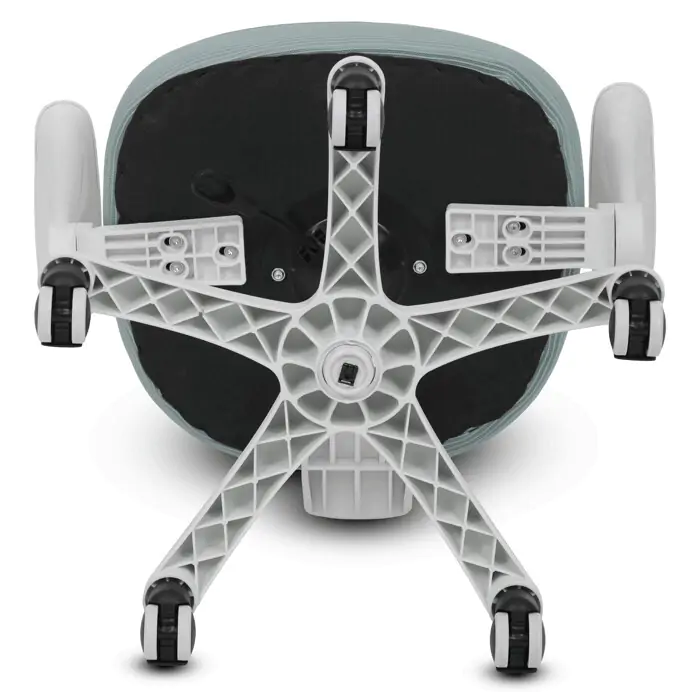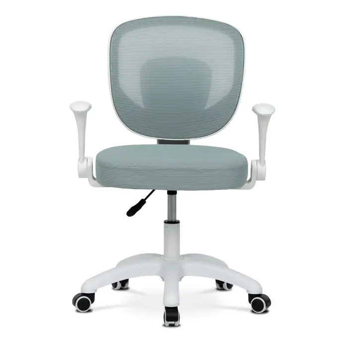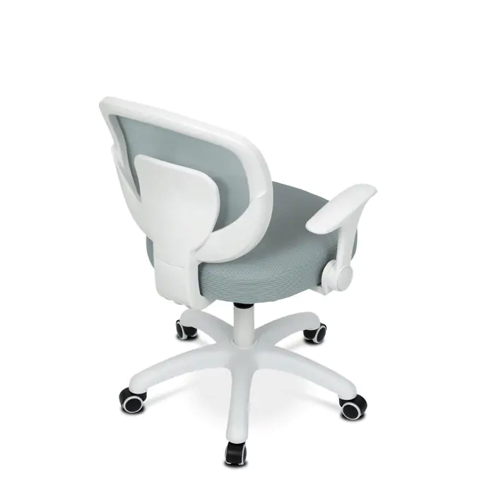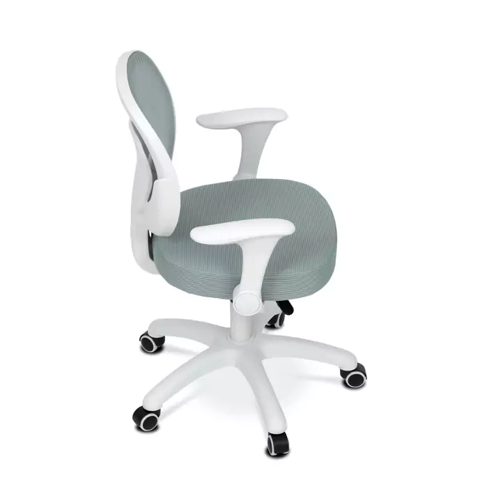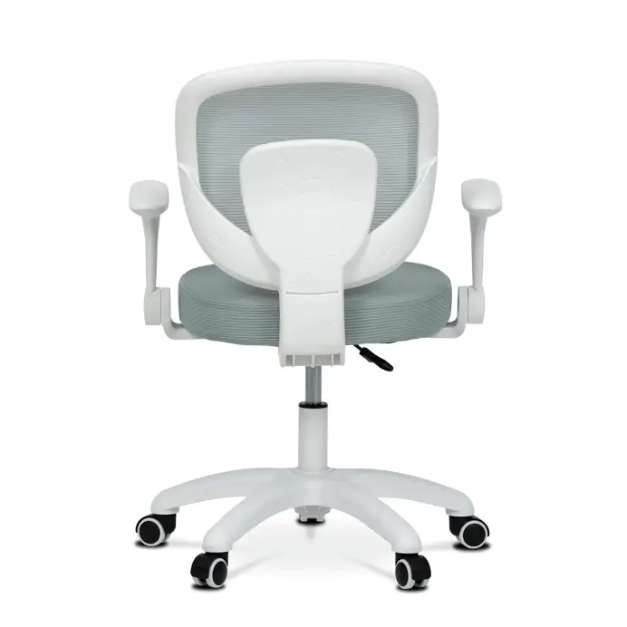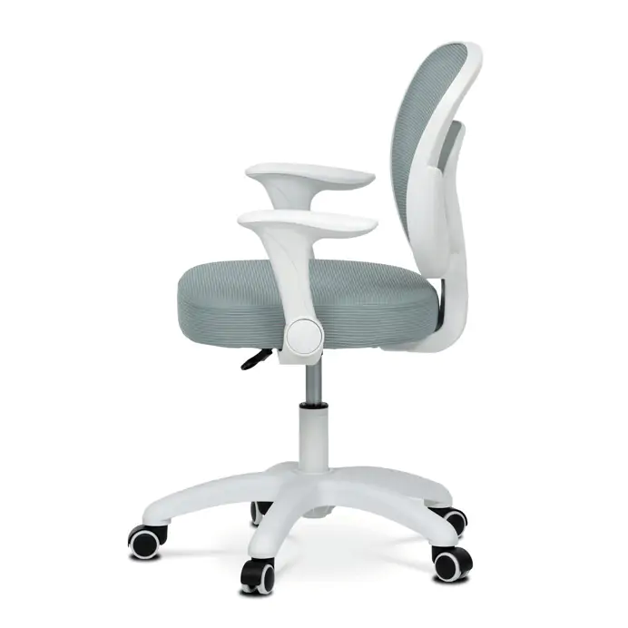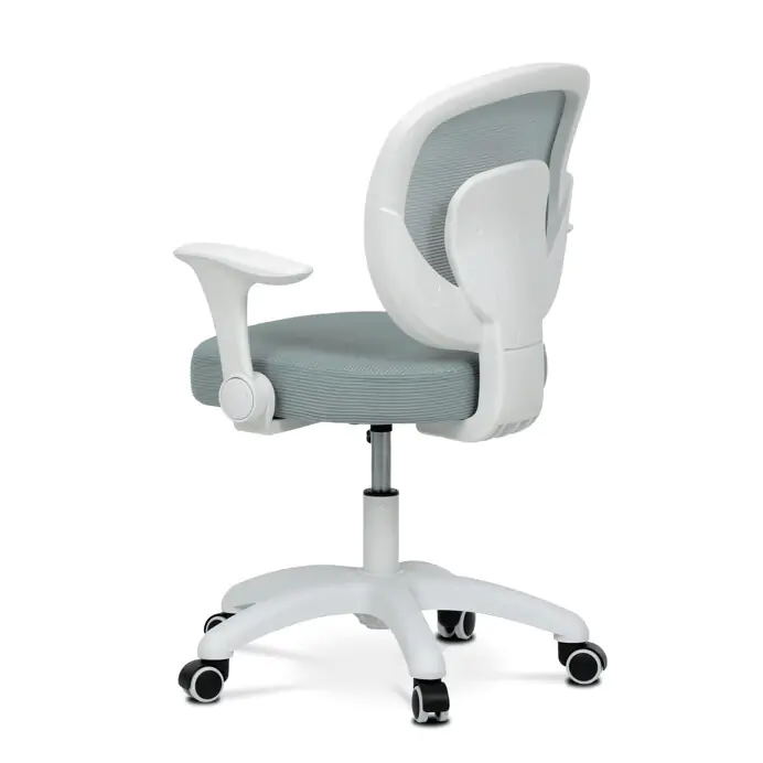 Sedák je čalouněný příjemnou šedozelenou látkou, zatímco opěradlo tvoří prodyšná síťovina podporující cirkulaci vzduchu během sezení. Odklápěcí područky umožňují snadné přizpůsobení prostoru a výškově nastavitelný mechanismus zajišťuje ergonomické sezení přizpůsobené dětskému uživateli. Plastový kříž s pěti rameny poskytuje stabilitu a kolečka jsou vhodná pro hladké povrchy, což usnadňuje pohyb židle.