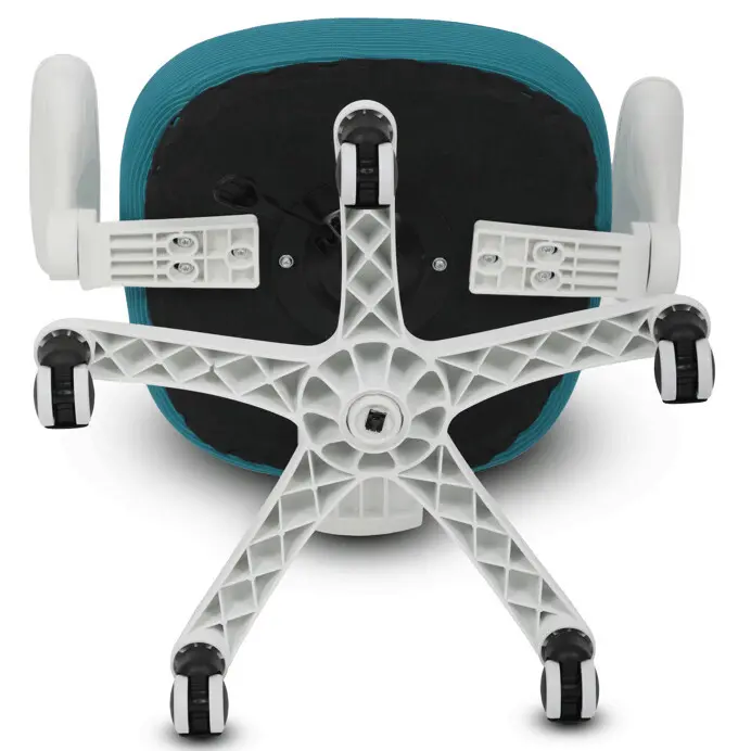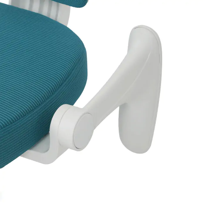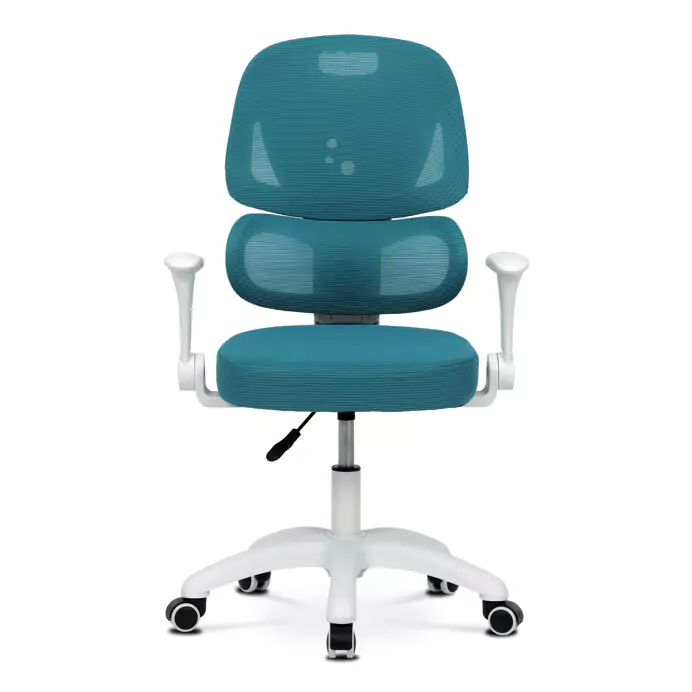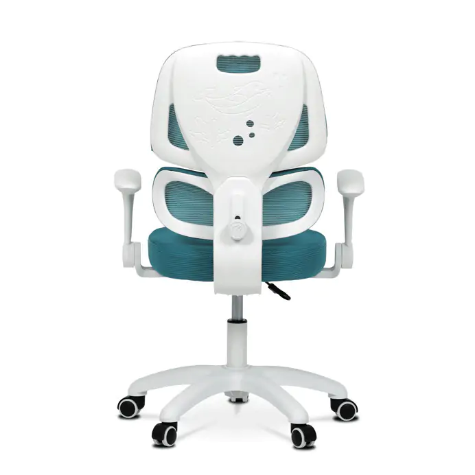 Opěradlo je vybaveno výškově nastavitelnou bederní opěrkou, která zajišťuje správnou podporu spodní části zad, a výškově nastavitelným opěrákem pro individuální přizpůsobení. Odklápěcí područky umožňují snadnější přístup k pracovnímu prostoru a zároveň šetří místo. Plastový bílý kříž zajišťuje stabilitu a lehkost celé židle, zatímco kolečka jsou vhodná pro tvrdé podlahy, což usnadňuje pohyb po místnosti. Výškově nastavitelný sedák umožňuje optimální přizpůsobení výšky sezení podle potřeby dítěte.