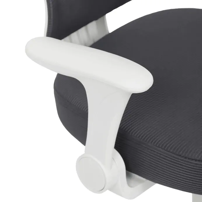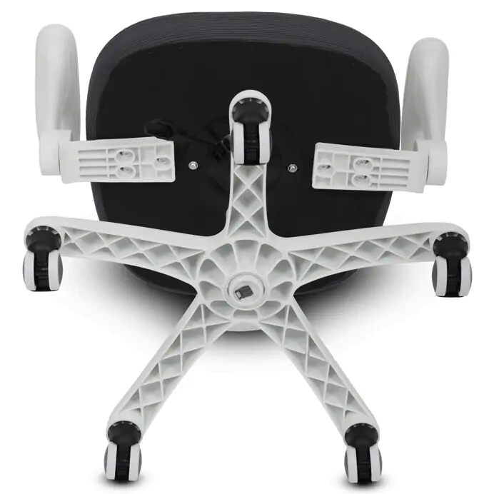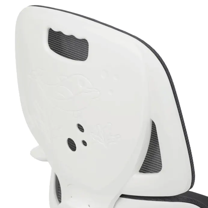 Sedák je potažený prodyšným materiálem, který zajišťuje optimální cirkulaci vzduchu během dlouhého sezení. Odklápěcí područky umožňují snadné přizpůsobení prostoru a bílý plastový kříž s kolečky je určený pro tvrdé podlahy, což zajišťuje stabilitu a snadnou mobilitu. Mechanika umožňuje plynulé nastavení výšky sedáku podle potřeby dítěte.