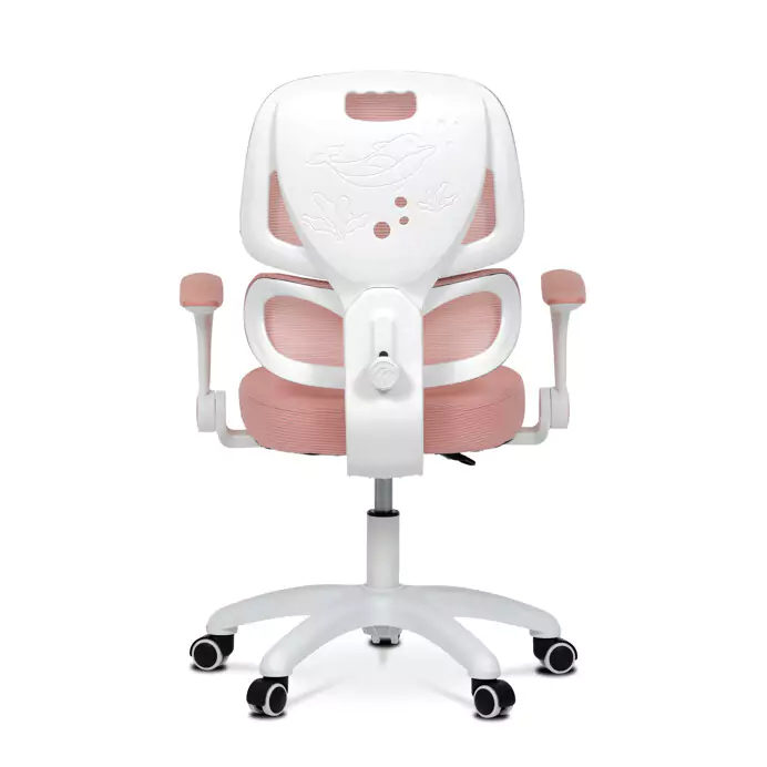 Opěradlo i sedák jsou potažené jemnou růžovou síťovinou, která zajišťuje dobrou cirkulaci vzduchu a příjemný komfort při sezení. Výškově nastavitelný opěrák a odklápěcí područky umožňují přizpůsobení židle aktuálním potřebám dítěte, zatímco pevný bílý plastový kříž s kolečky určenými pro tvrdé podlahy zajišťuje stabilitu a snadnou mobilitu.