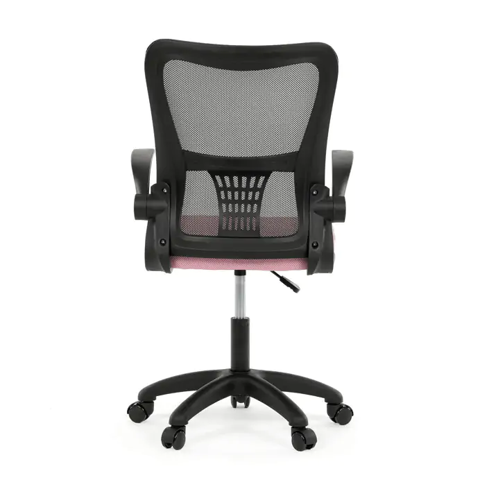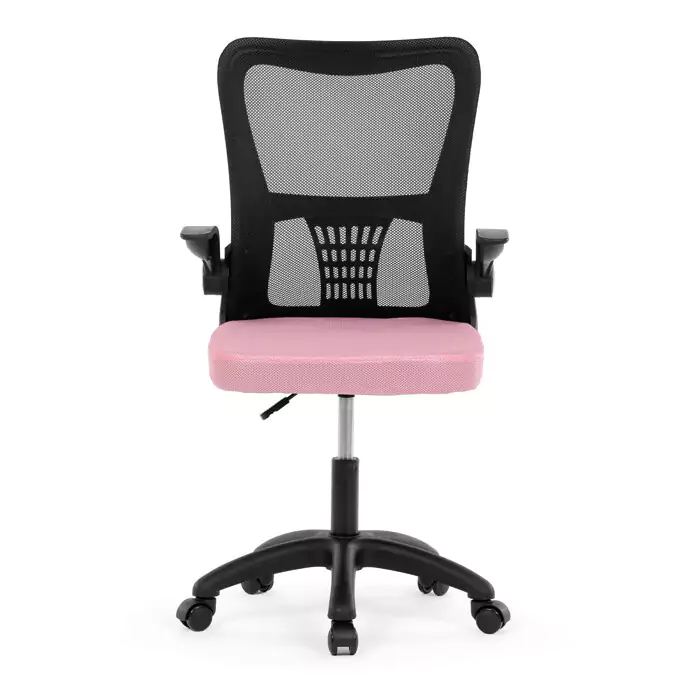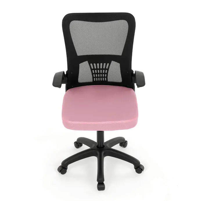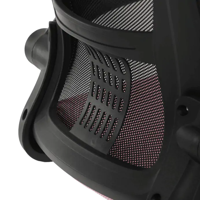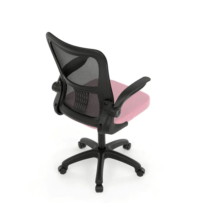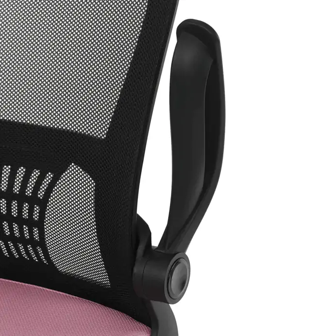 Opěrák je vyroben z černé prodyšné síťoviny, která zajišťuje optimální cirkulaci vzduchu a podporuje pohodlí při delším sezení. Sedák je čalouněný růžovou látkou s dostatečnou výplní pro komfortní posed. Odklápěcí plastové područky umožňují snadné přizpůsobení pracovnímu prostoru a zvyšují flexibilitu používání.