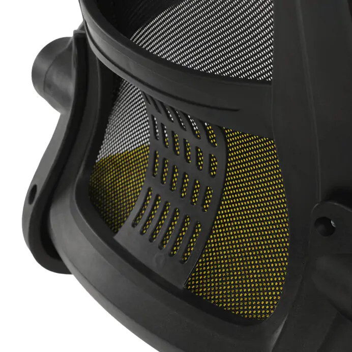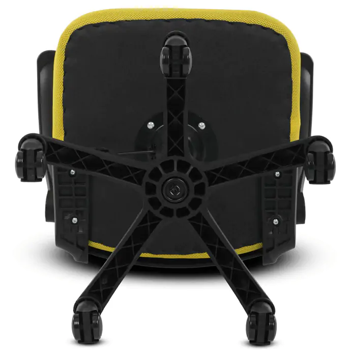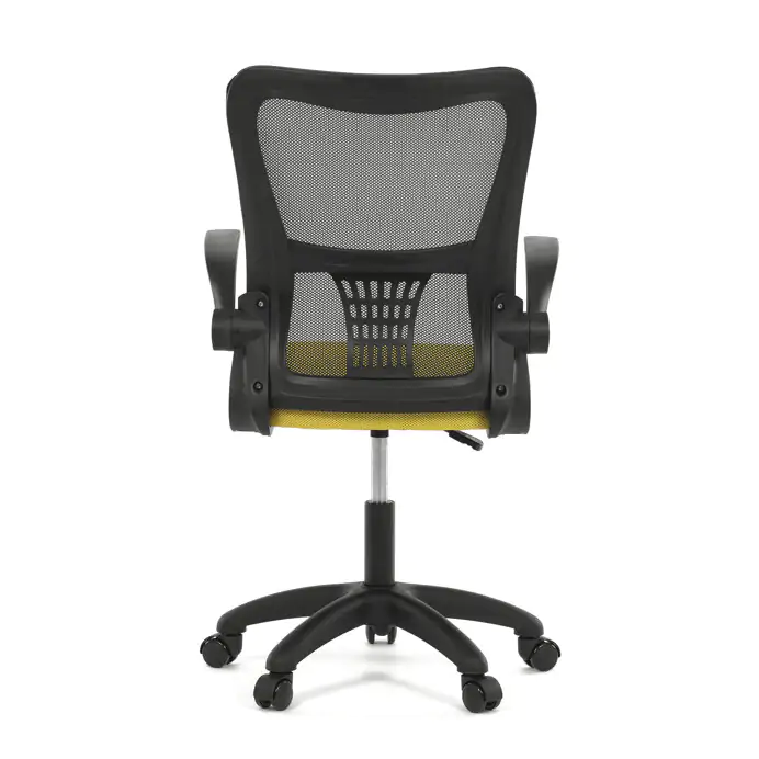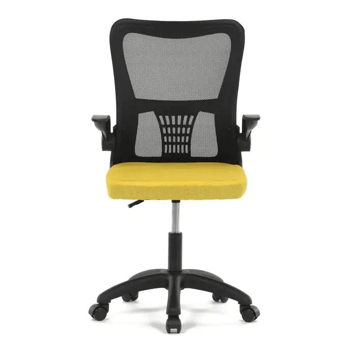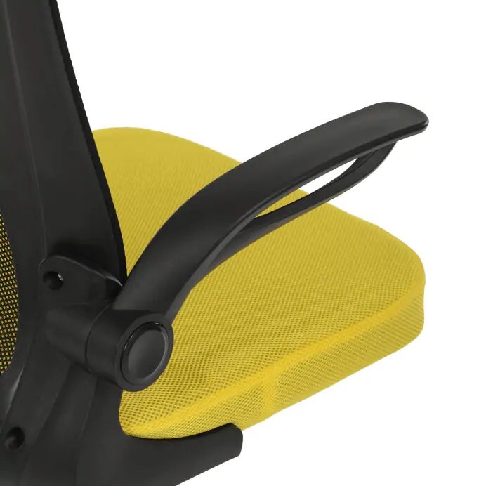 Opěrák je vyroben z černé prodyšné síťoviny, která zajišťuje optimální cirkulaci vzduchu a podporuje pohodlí během dlouhého sezení. Sedák je potažen žlutou látkou, která přináší živý barevný akcent a je vyplněn komfortní pěnou. Odklápěcí plastové područky umožňují snadné přizpůsobení prostoru a lepší manipulaci s židlí.