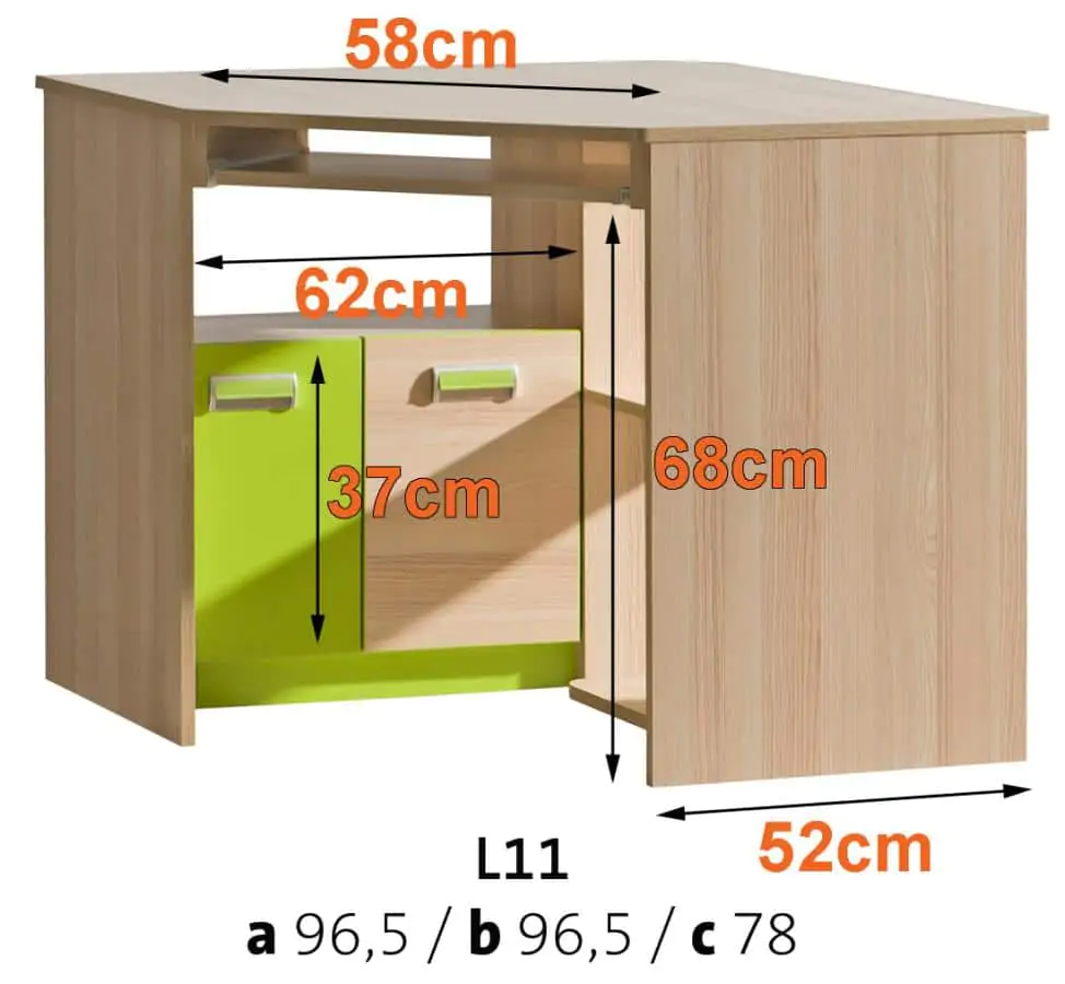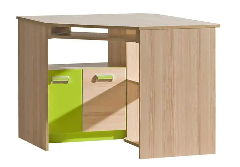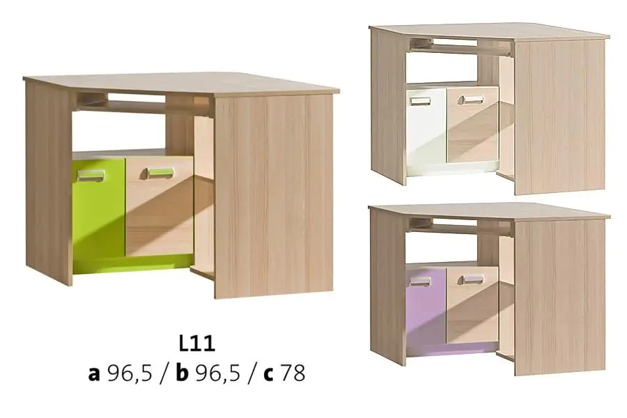 Element kolekce Teo - psací stůl rohový v provedení: - jasan coimbra + fialová - jasan coimbra + zelená limetka   Interiér: za dveřmi volný prostor   Rozměry: bok 52 cm / čelo 58 cm ...