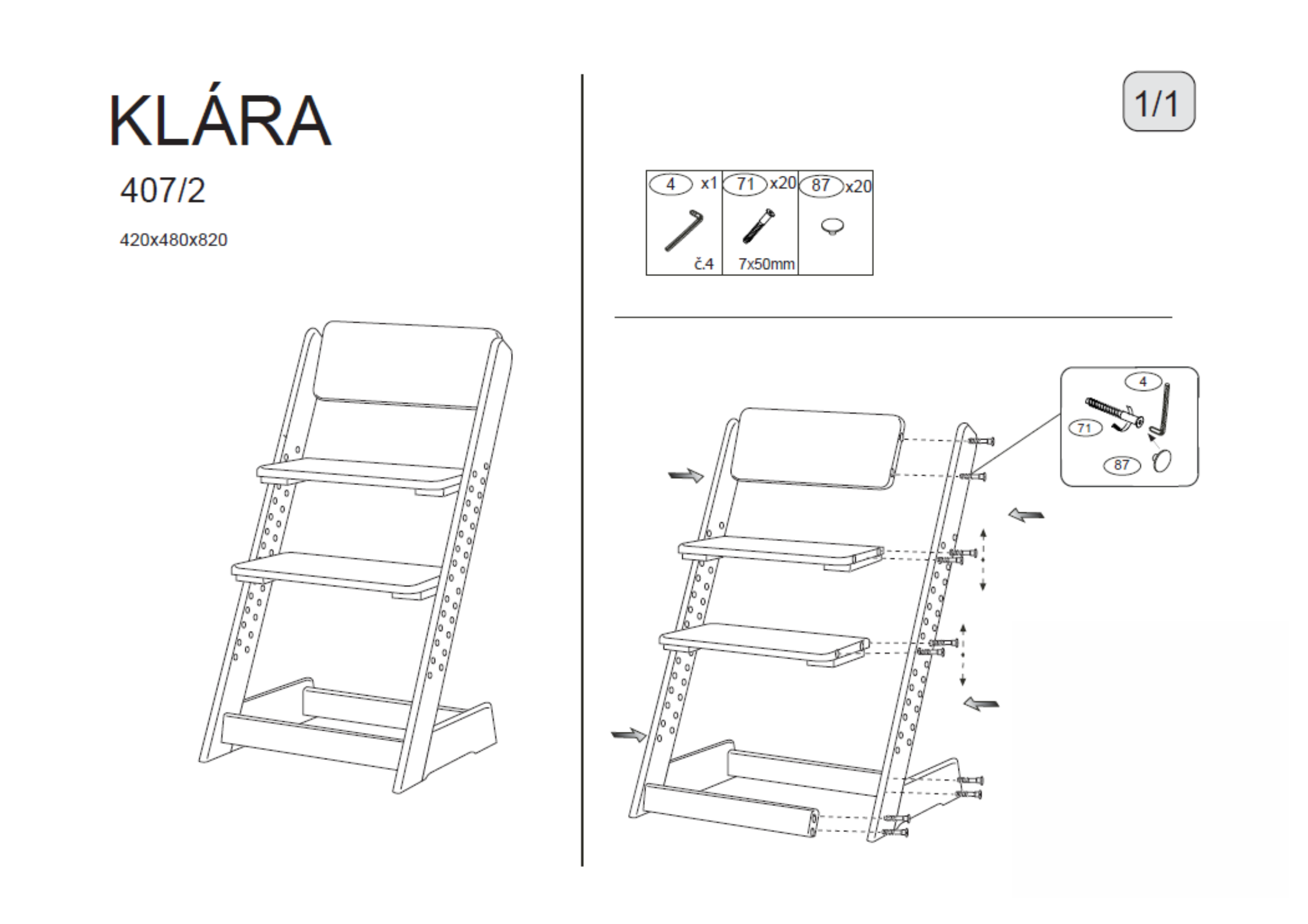 Dětská rostoucí židle je dodávaná v rozloženém stavu a zabalená v kartonu společně s návodem a s upevňovacím materiálem.