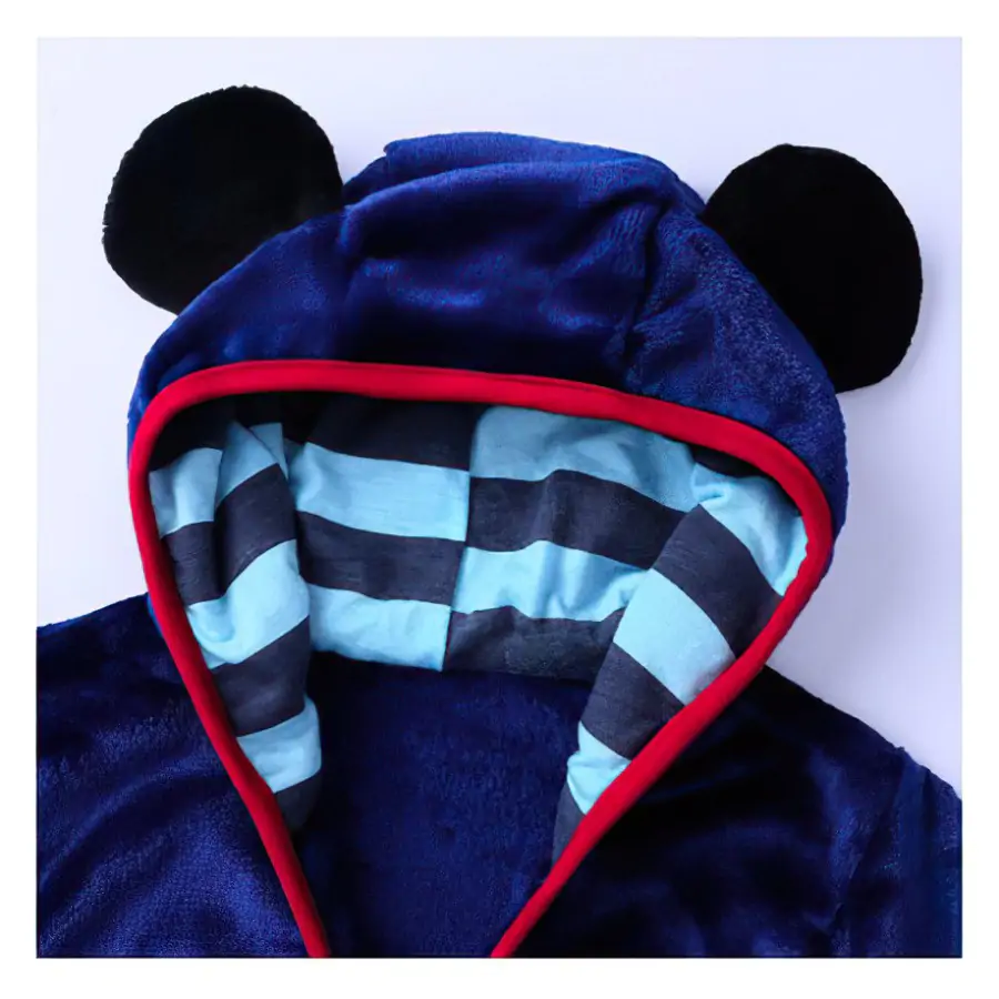 Kapuce je ozdobena roztomilými ušima, které připomínají postavičku myšáka, a vnitřní strana je v pruhovaném provedení, což dodává celkovému designu hravost a zábavu. Tento župan si vaše dítě určitě zamiluje.