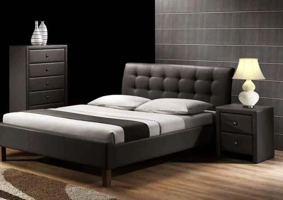 Čalouněná postel s vysokým, ozdobně prošívaným čelem je zhotovena z ekokůže.
