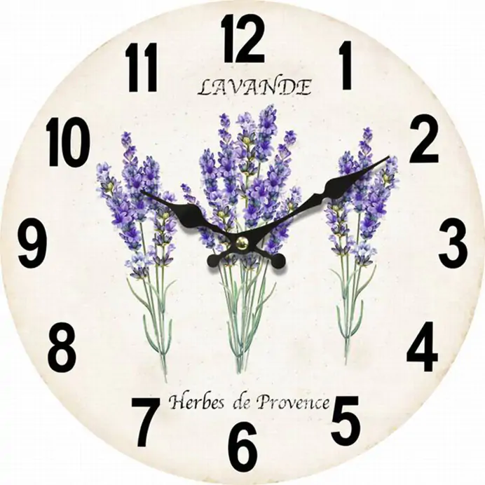 Nástěnné hodiny HA1725 o průměru 34 cm jsou vyrobené z MDF materiálu v bílé barvě s jemným dekorem levandulí, který přináší do prostoru příjemnou atmosféru Provence.