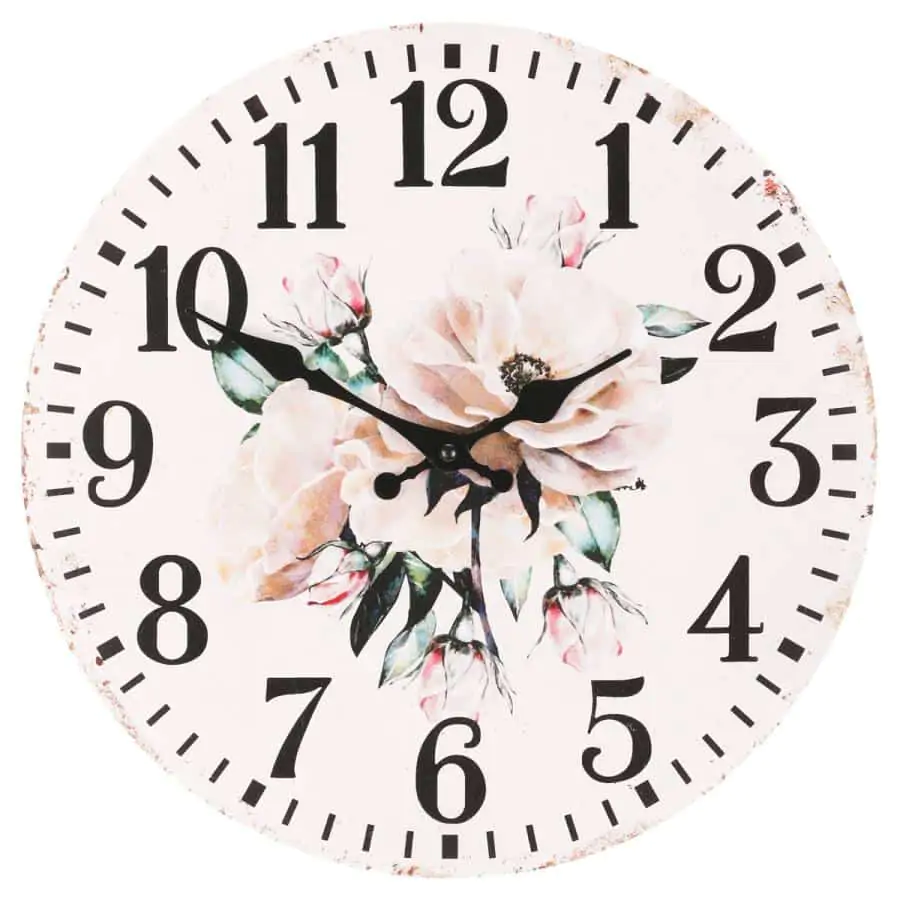 Nástěnné hodiny s motivem růží HA1728 se stanou ozdobou vašeho interiéru. Hodiny jsou vyrobené z MDF o průměru 34 cm. Použijte 1 baterii AA, není součástí. Vintage provedení - trhlinky, šmouhy...