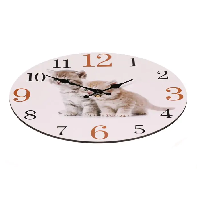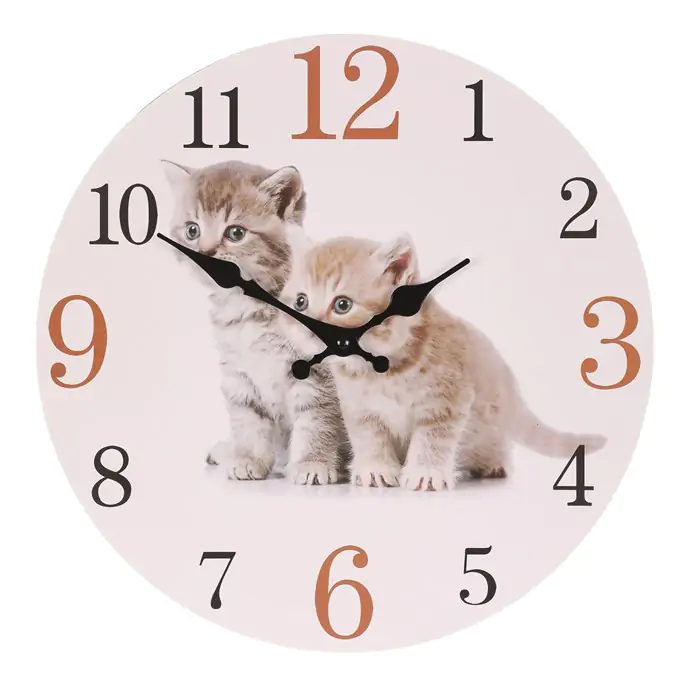 Vyrobené jsou z MDF desky, jsou tudíž lehké a mají černé a hnědé arabské číslice, které krásně vynikají na bílém pozadí. Koťata dodávají hodinám neodolatelný šarm a jemný nádech, který potěší každého, kdo se na ně podívá.