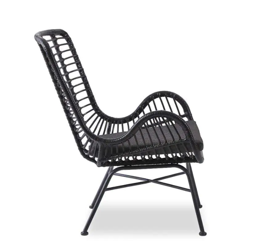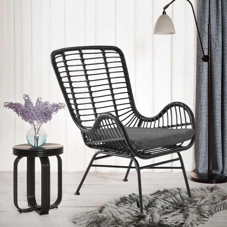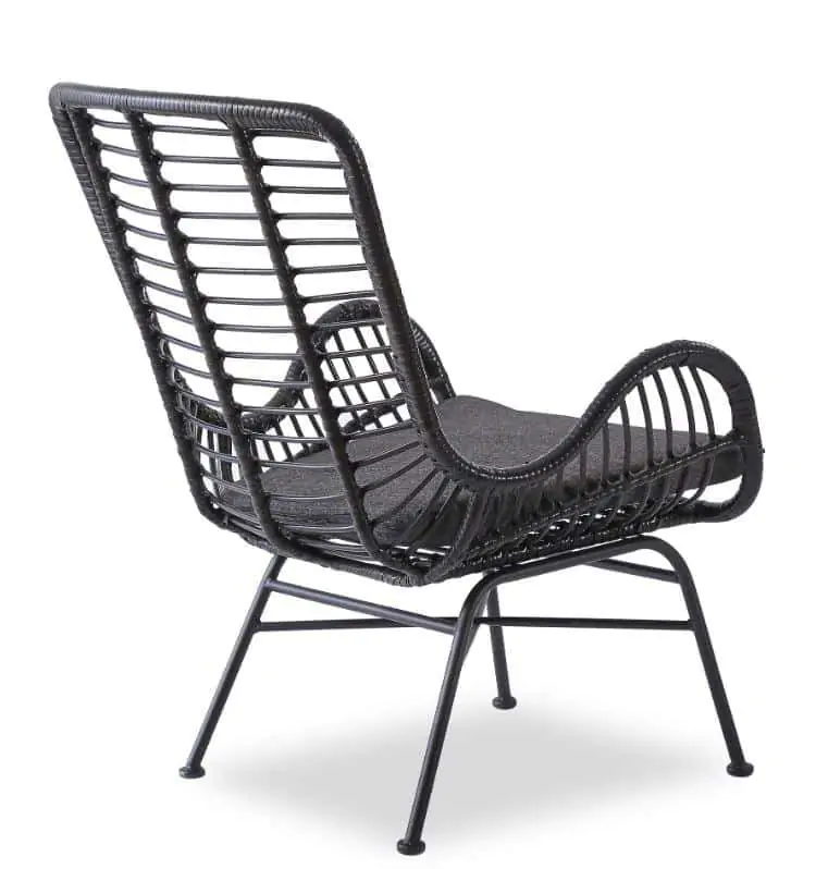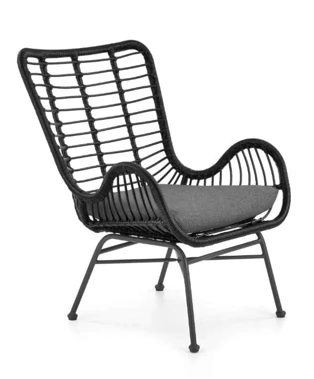 Moderní křeslo z umělého ratanu v černé barvě.