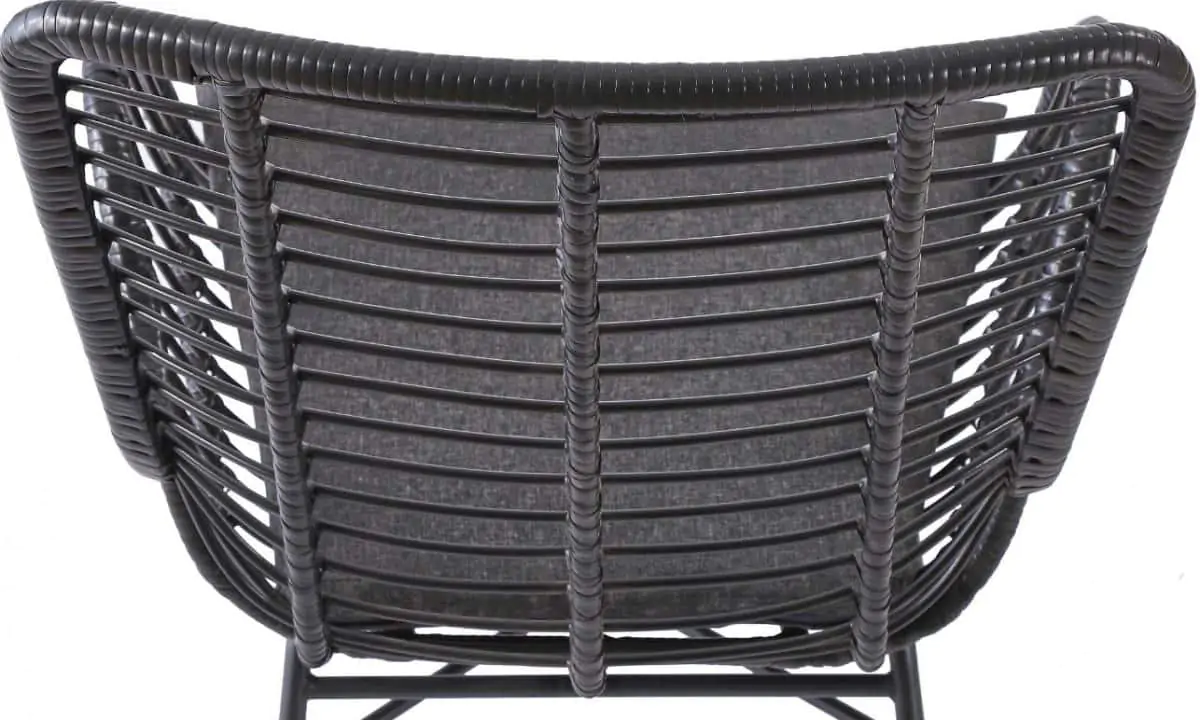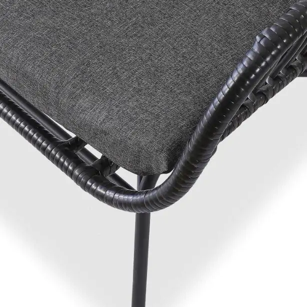 Moderní křeslo z umělého ratanu v černé barvě. Stabilitu zajišťují ocelové nohy. Pohodlí při sezení znásobí sedák čalouněný šedou látkou. Dodávané v demontu.