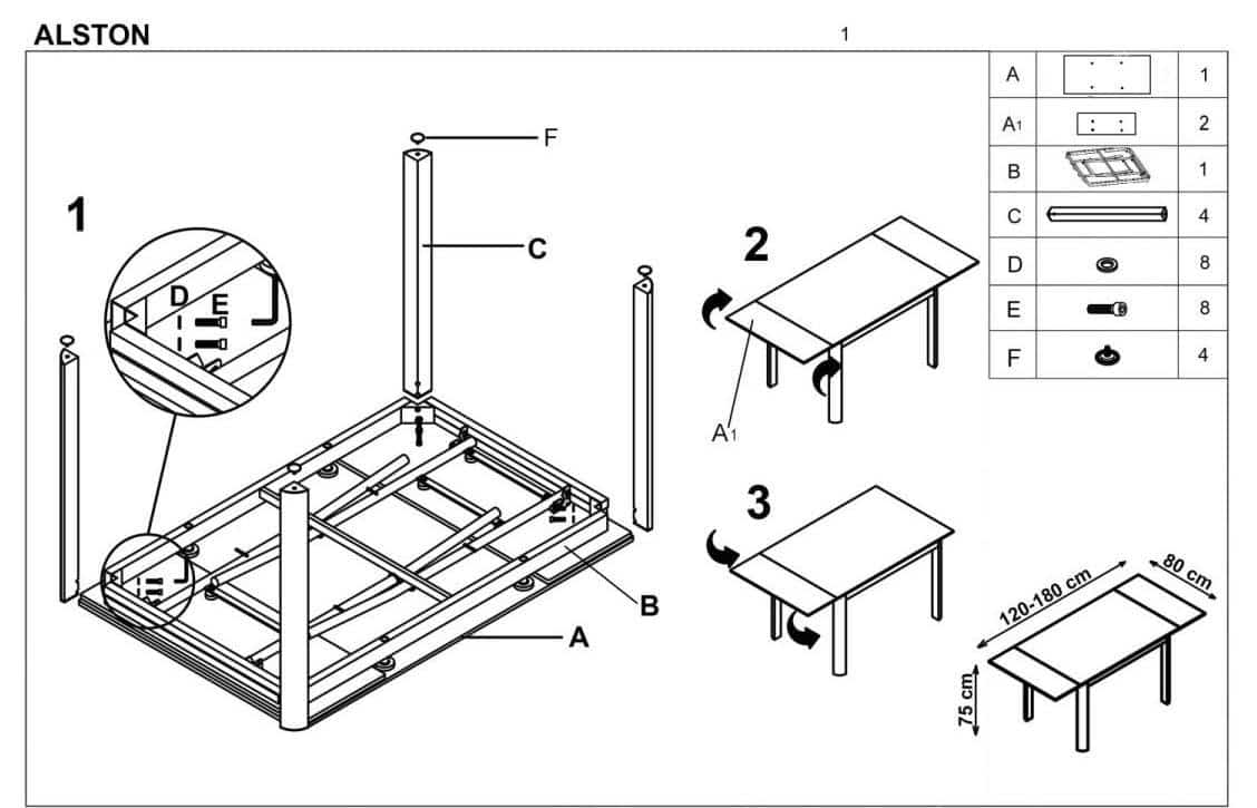 V nerozloženém stavu má stůl rozměry 120x80 cm, po rozložení jej lze rozšířit až na rozměry 180x80 cm.