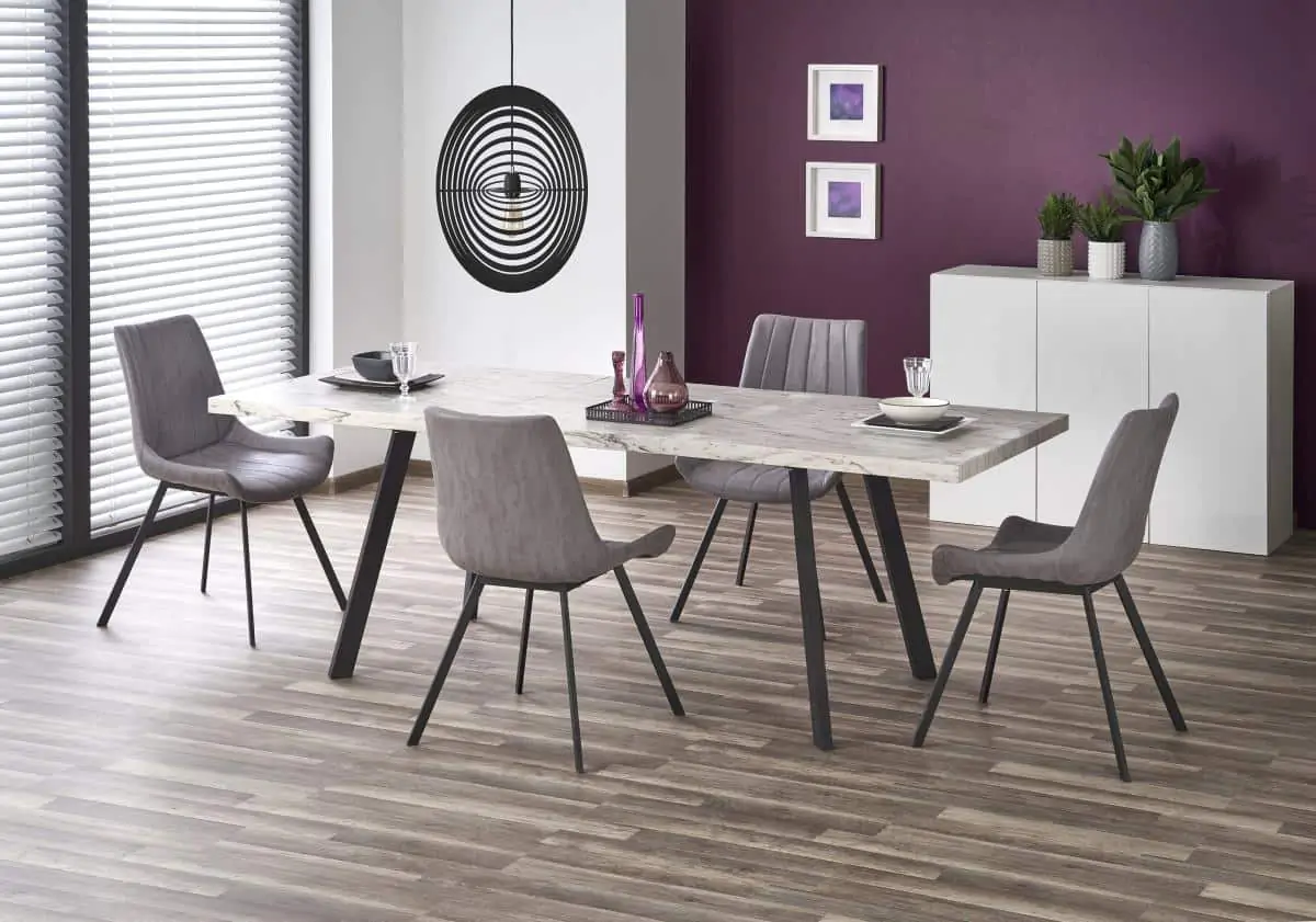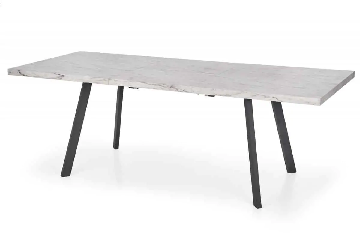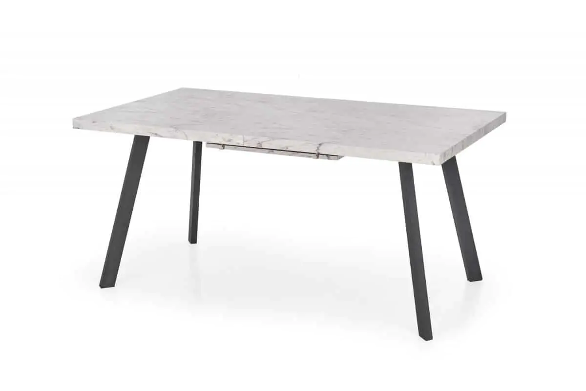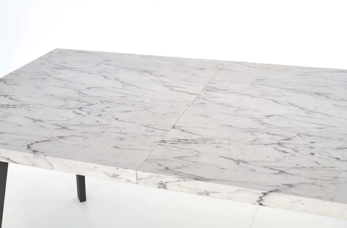Jednoduchý rozkládací jídelní stůl v industriálním stylu je zhotoven z laminované MDF v barvě mramor. Černé kovové nohy jsou z práškované ocele.