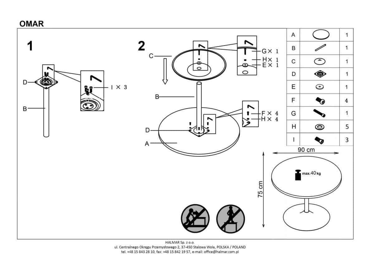 Kulatý jídelní stůl Omar je vyroben v kombinaci centrální chromové podnože a bílé laminované MDF desky. Ilustrační obrázek, židle nejsou součástí stolu. Stůl je dodáván v demontu.