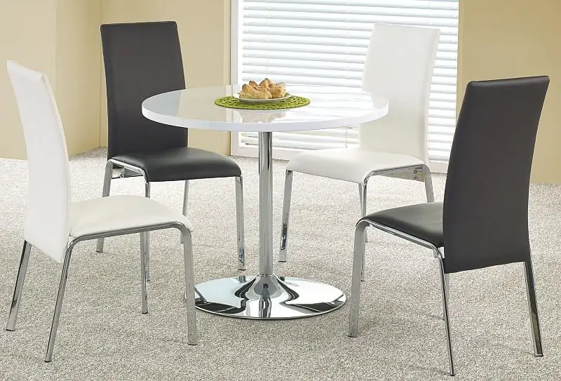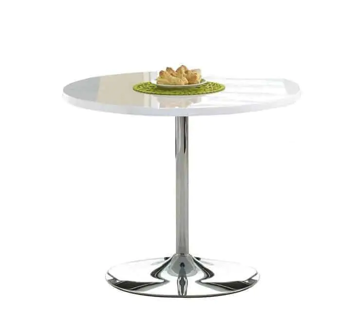 Kulatý jídelní stůl Omar je vyroben v kombinaci centrální chromové podnože a bílé laminované MDF desky.
