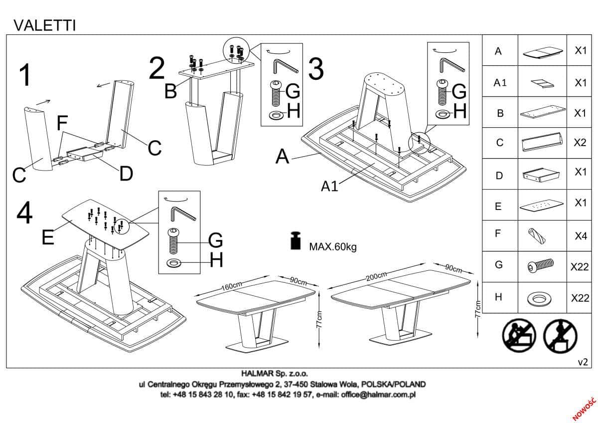 V nerozloženém stavu má stůl rozměr 160x90 cm, po rozložení 200x90 cm.