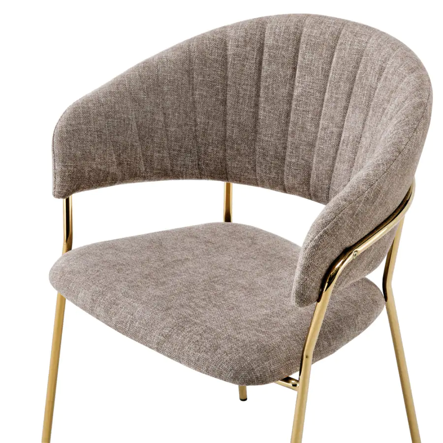 Spojení moderního designu a pohodlného sezení zajistí novinka v podobě jídelního křesla DASMIN TYP 1. Díky spojení kombinace látky v hnědé barvě a chromu na konstrukci v provedení gold zlatý se z něj stává stylové a elegantní křeslo.
