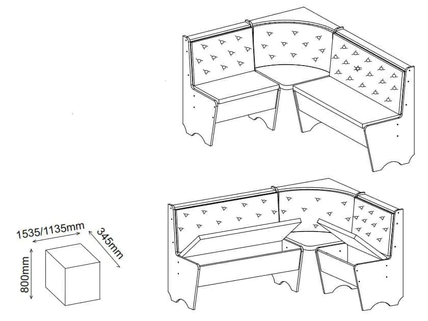 - rohová lavice s ÚP, v/š/h: 80 / 153,5 x 113,5 / 46 cm