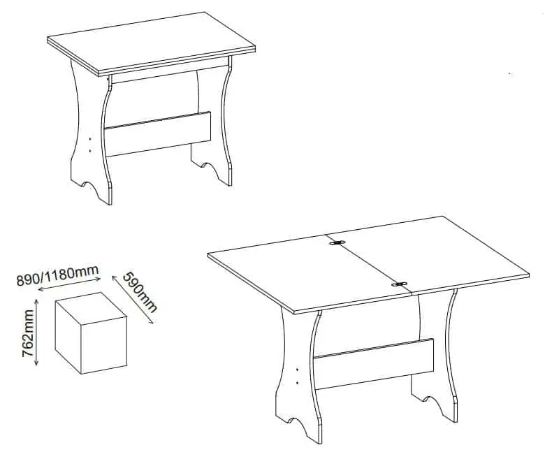 - rozkládací jídelní stůl: v/š/h: 76 / 89-118 / 59 cm.