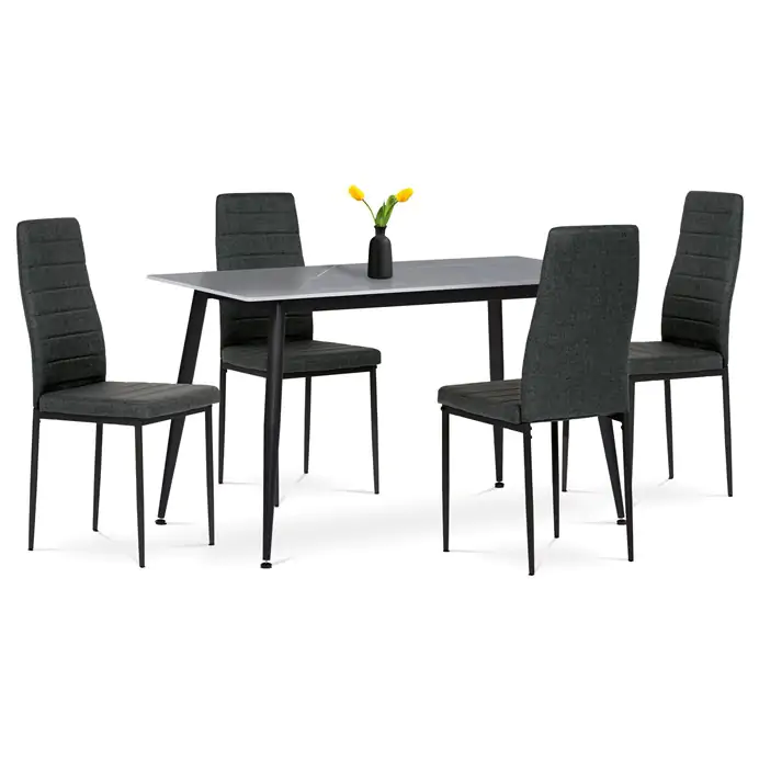 Moderní jídelní set ASE-1003 BK2 v industriálním stylu je skvělou volbou pro vaši jídelnu. Obdélníkový stůl s deskou ze slinuté keramiky v šedém mramorovém dekoru působí elegantně a je odolný vůči poškrábání. Stabilitu zajišťují černé kovové nohy s jemně kónickým tvarem.