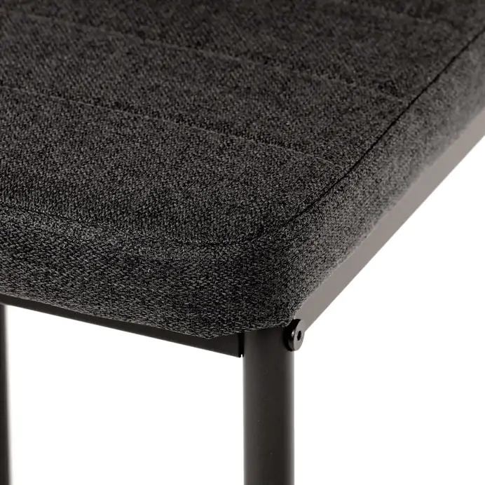 Pohodlné židle mají čalounění z hladké černé látky a ergonomicky tvarovanou opěrku pro maximální komfort. Černé kovové nohy ladí se stolem a dodávají celku jednotný vzhled. Ideální volba pro stylové a funkční stolování.