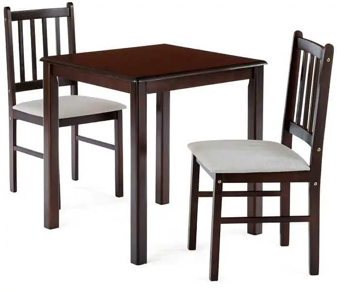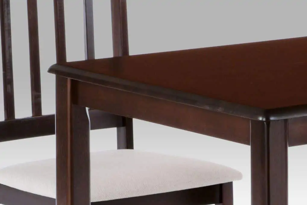 Jídelní set se skládá ze 2 židlí a stolu čtvercového tvaru. Sestava je vyrobena z dýhovaného kaučukového dřeva v moření ořech.