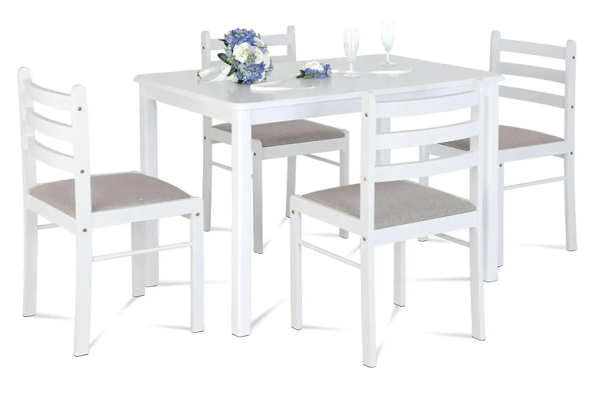 Jídelní set se skládá ze stolu a 4 čalouněných židlí bílé barvy.  Látkový potah sedáků je šedohnědé melírované barvy. Židle a nohy stolu jsou vyrobeny z masivu opatřené dýhou. Deska...