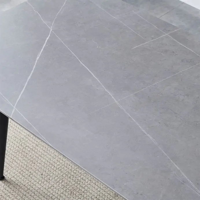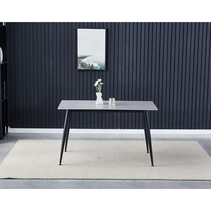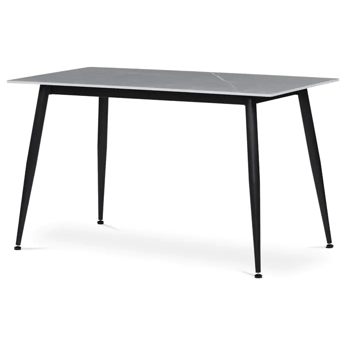 Jídelní stůl HT-403M GREY s rozměry 130x70x76 cm nabízí desku z kvalitní slinuté keramiky v imitaci matného šedého mramoru, která je odolná vůči poškrábání a snadno se udržuje.