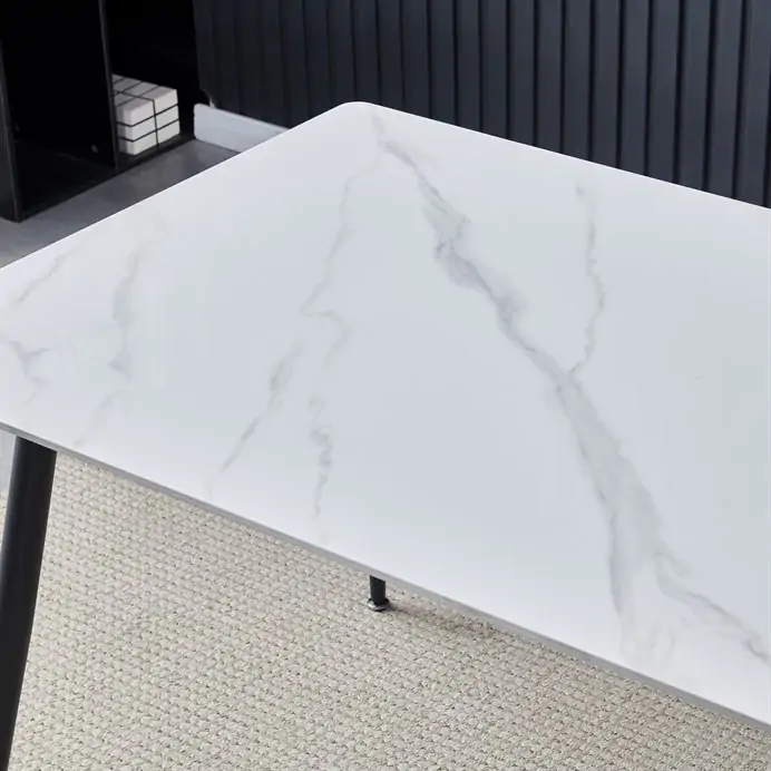Deska stolu je vyrobena ze slinuté keramiky v matném provedení s jemnou imitací mramoru, která nabízí odolnost proti poškrábání a snadnou údržbu. Zaoblené rohy desky přispívají k bezpečnosti a zároveň dodávají stolku elegantní vzhled.