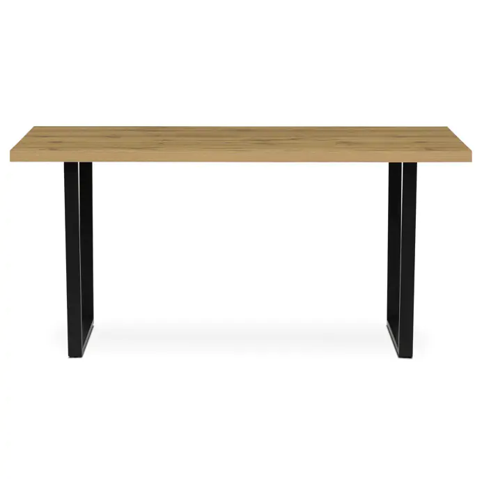 Jídelní stůl HT-R5216 OAK o rozměrech 160x80x76 cm kombinuje desku z hnědého lamina s dekorem dubu a stabilní kovovou podnož v černém matném provedení.