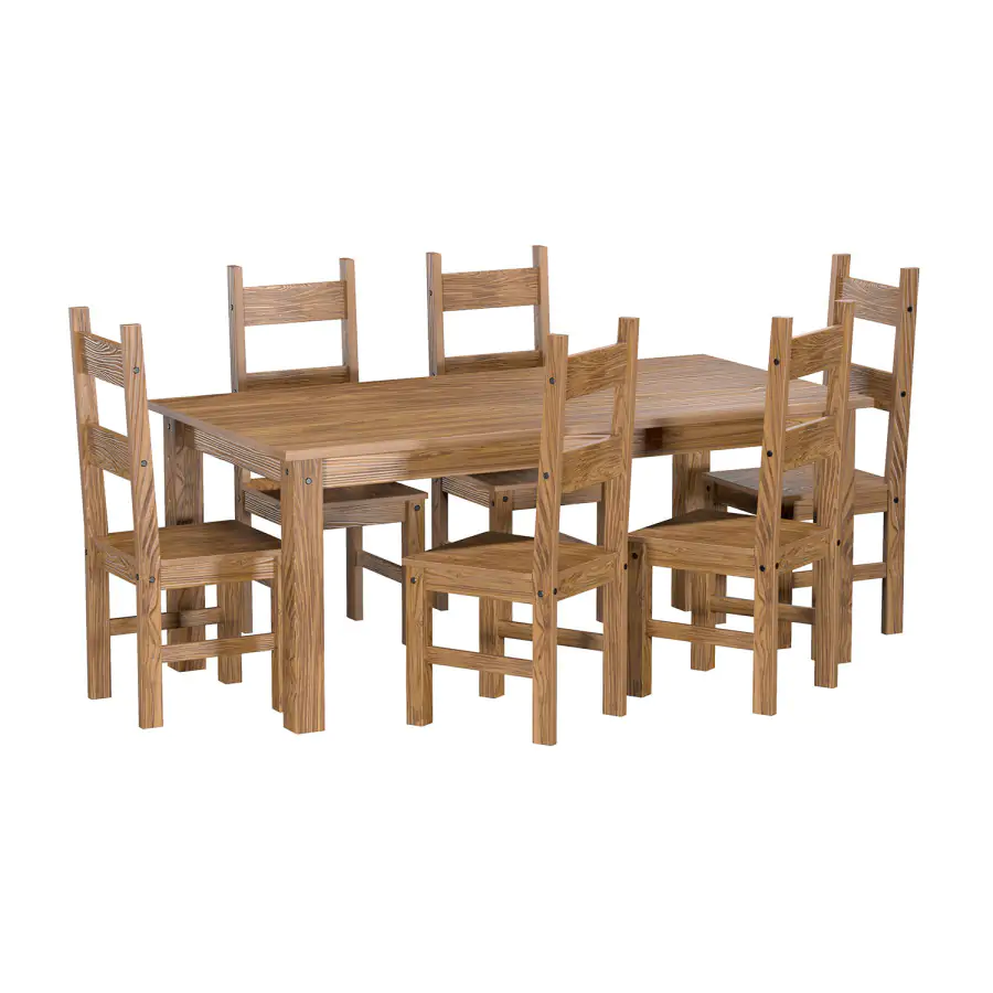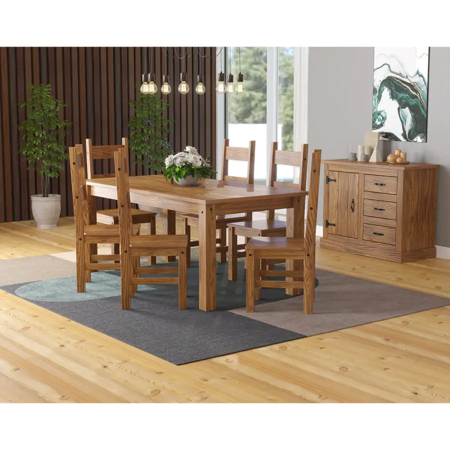 Jídelní set sestává z prostorného obdélníkového stolu a 6 židlí z pevného borovicového masivu v dekoru dub antik s přiznaným vlisem.
