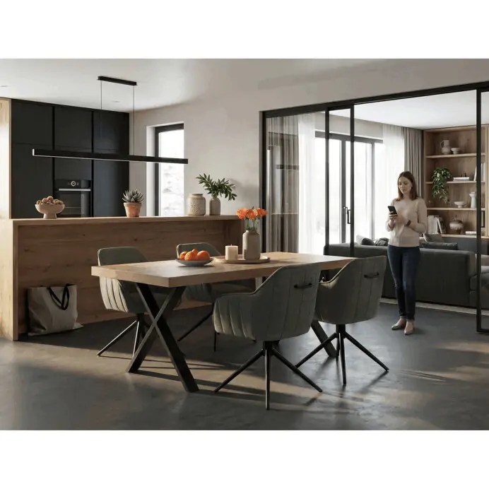 Stůl je navržen bez rozkládací funkce, což podtrhuje jeho jednoduchost a robustnost. Výška 76 cm odpovídá standardním ergonomickým parametrům pro pohodlné sezení u jídelního stolu.