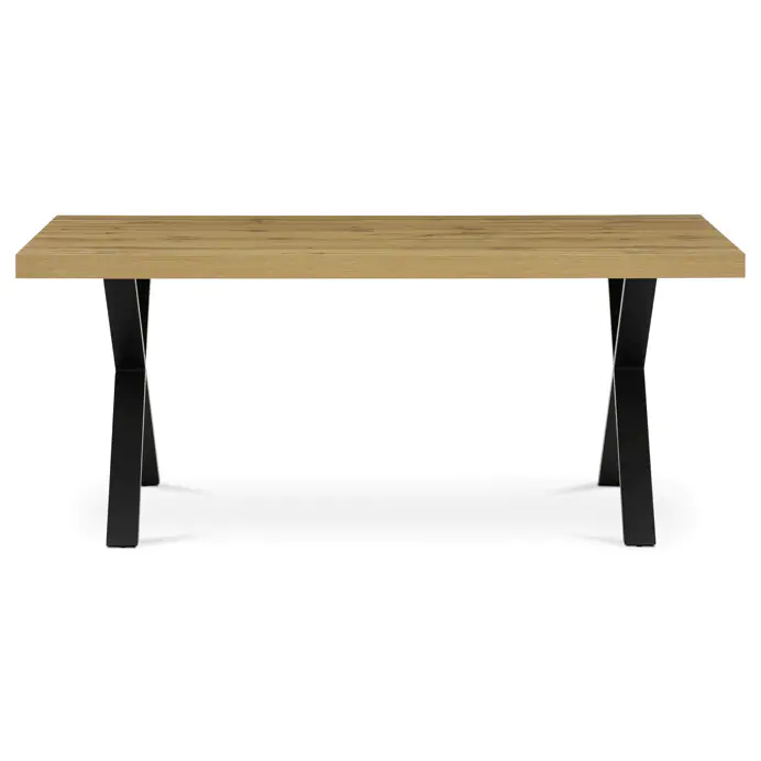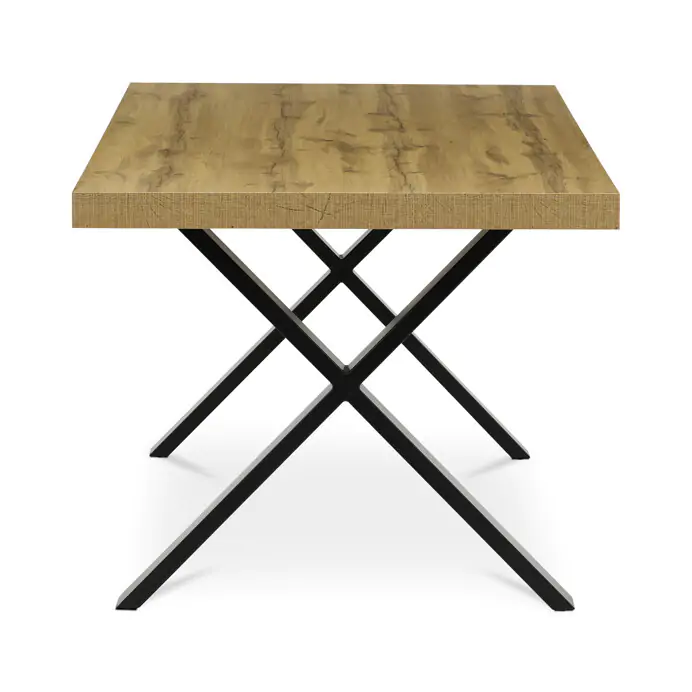 Deska je opatřena ABS hranou, která chrání okraje před poškozením a usnadňuje údržbu. Stabilní kovové nohy ve tvaru X v černém provedení zajišťují pevnou oporu a moderní industriální vzhled.